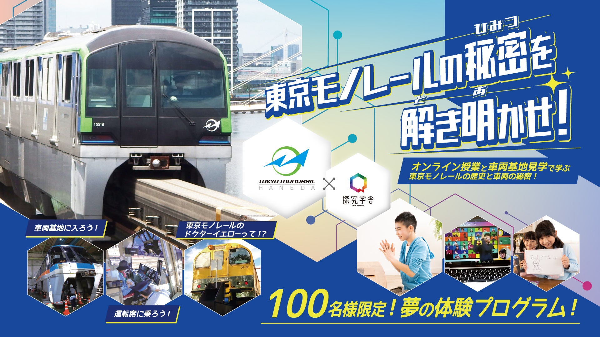 このたび、株式会社探究学舎は東京モノレール株式会社の協力のもと「東京モノレールの秘密を解き明かせ!」という名称のオンライン授業と車両基地見学のイベントを行います。初めにオンライン授業にてモノレールへの興味関心を高めた後、実際に足を運び車両基地を見学をすることで子どもたちの知的好奇心に火をつける設計となっています。