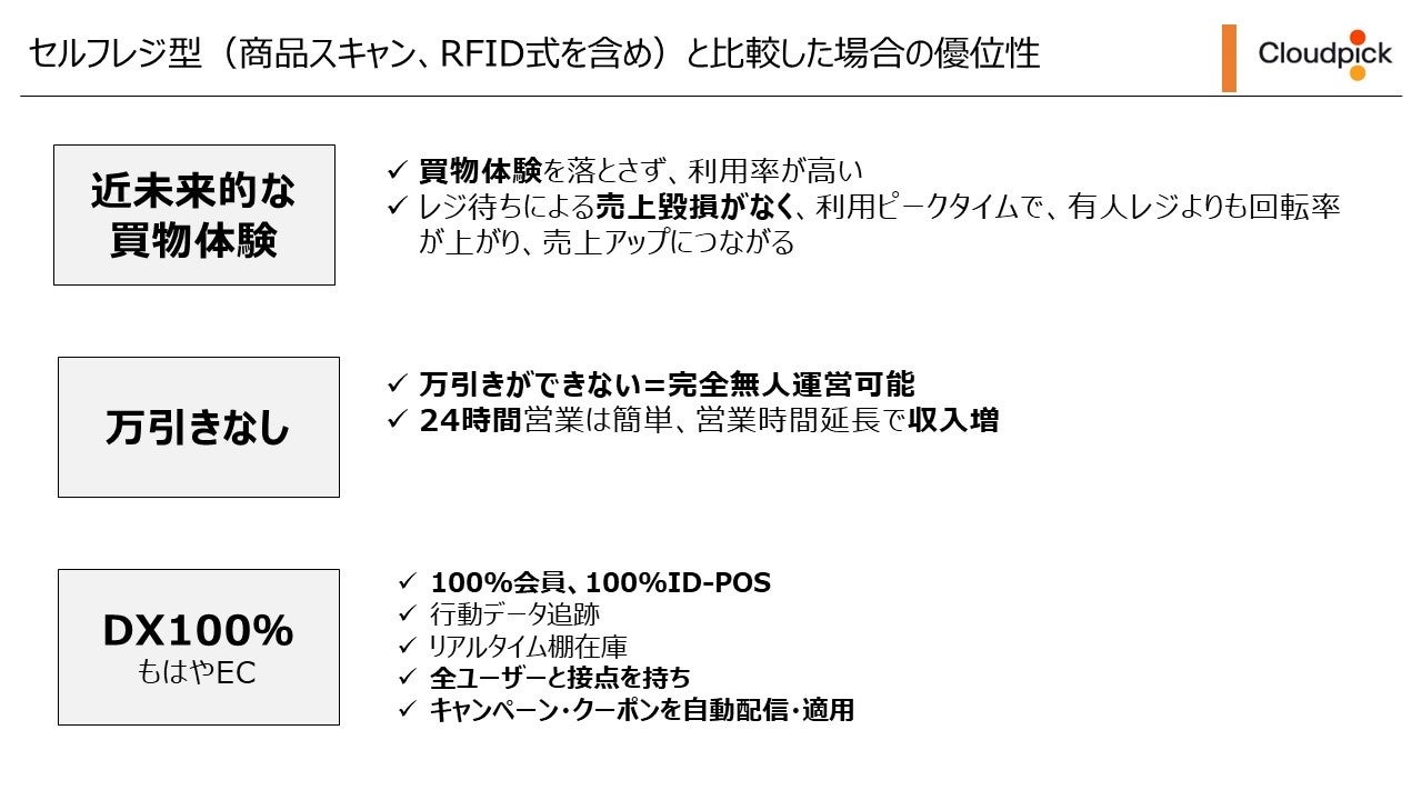 Cloudpick(本社:中国・上海)は買い物体験およびリアル店舗の破壊的デジタル変⾰をミッションに、 ウォークスルー無⼈店舗などの店舗DXソリューションを⼿がける会社です。現在、⽇本(東京、神奈川、 ⼤阪、福岡、⻑野、⽯川など)、アメリカ、ドイツ、シンガポール、韓国、中国など世界19か国でウォークスルー無⼈店舗を900軒以上(そのうち、日本は20軒以上)の導入実績を持っております。 AI、IoTの科学者やエンジニアを集めた⾃社R&Dチームが開発したハードウェアとソフトウェア、そして 圧倒的な導⼊実績から培った店舗運営の現場ノウハウを駆使し、商品や消費者⾏動などを⾼い精度で認 識します。また、スピーディーな⾃動決済、より広い⾯積の店舗導⼊、より⾼いシステム拡張性などを 強みに、未来的な買い物体験を創出する⼀⽅で、店舗の無⼈・省⼈化による低コスト運⽤を実現します 。
