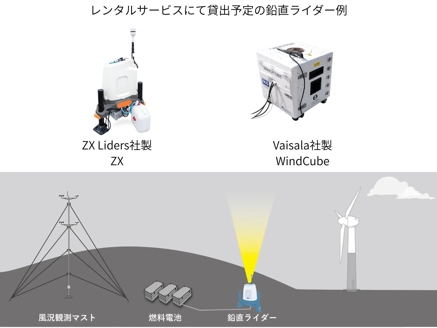 MUFLと レラテックは、2025年1月9日付プレスリリース(※2)の通り、風力発電事業に必要な風況観測マストをはじめ、鉛直ライダーや燃料電池といった観測機器を対象としたリースなどのファイナンスを提供しております。 一方、これまで、風力発電事業者や風況観測事業者からは、短期利用を目的としたレンタルサービスの要望が寄せられたことから、本協定に基づき鉛直ライダーのレンタルサービスを開始いたします。