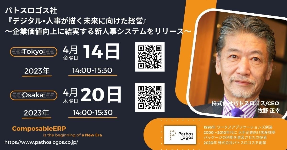 株式会社パトスロゴス(本社:東京都品川区、代表取締役:牧野正幸、以下、「当社」という)は、このたび「HR共創プラットフォーム」と人事給与SaaSの「Combosite」のローンチに伴いご期待いただいている多くのお客様に向けて新製品披露のセミナーを開催いたします。東京での開催は4月14日(金)に九段下会館テラス 302-茜(東京都千代田区九段南1-6-5 九段会館テラス)にて、そして大阪は4月20日(木)にグランフロント大阪 ナレッジキャピタル コングレコンベンションセンター(大阪市北区大深町3-1 グランフロント大阪 北館 B2F)にてそれぞれ開催いたします。開催時間は両会場とも14:00-15:30(開場13:30)となっており、東京は現地参加およびオンラインのハイブリッド開催となり、大阪は現地参加のみの開催形式になっております。いずれも参加費用は無料となります。