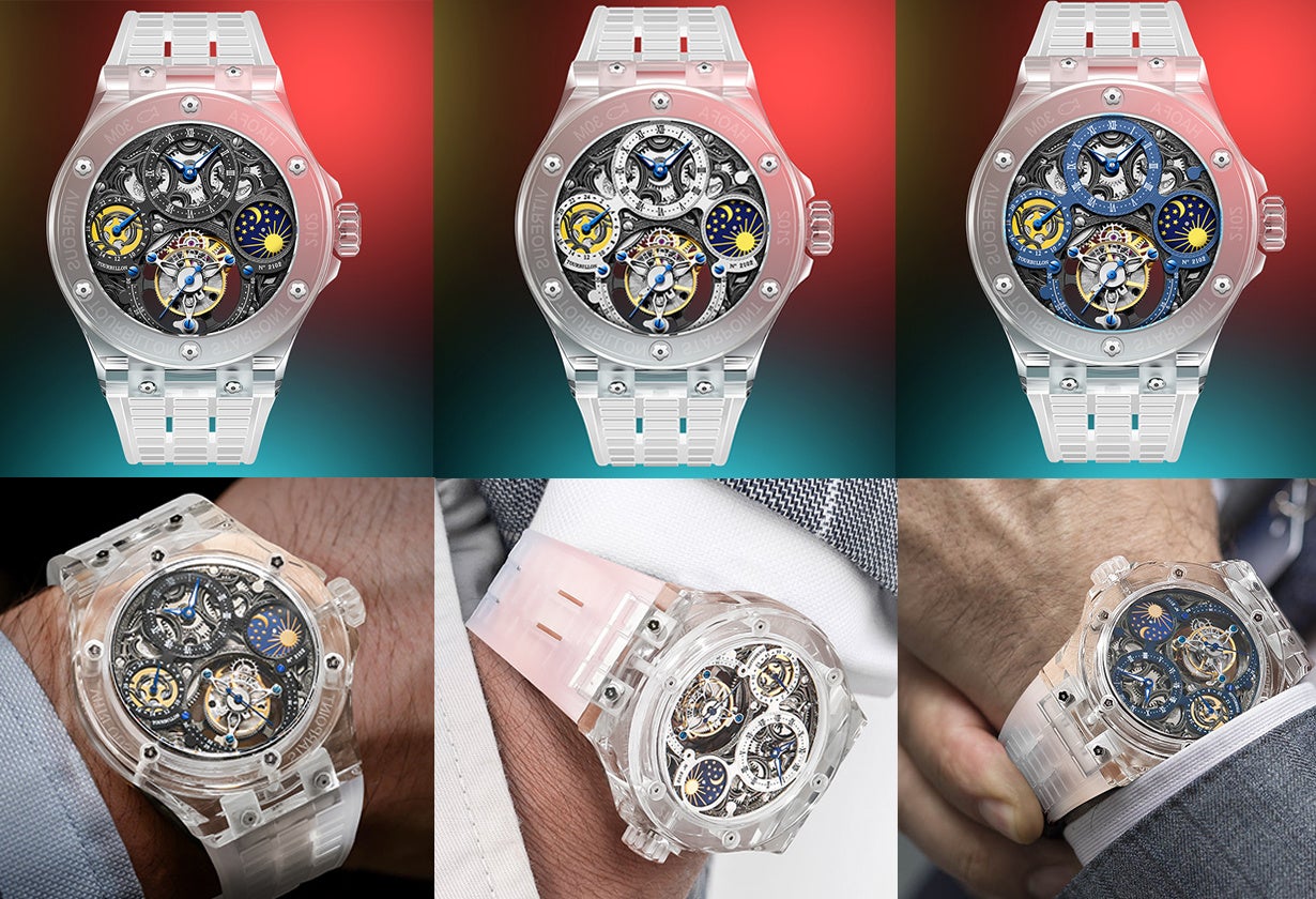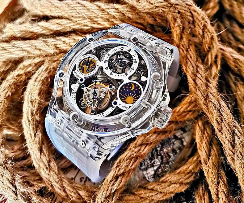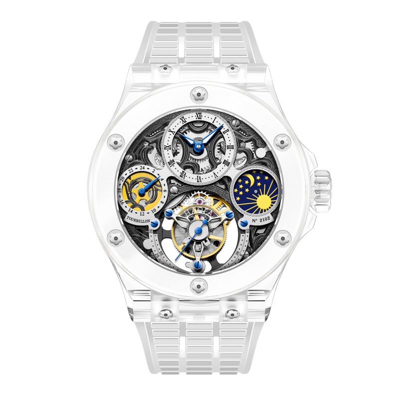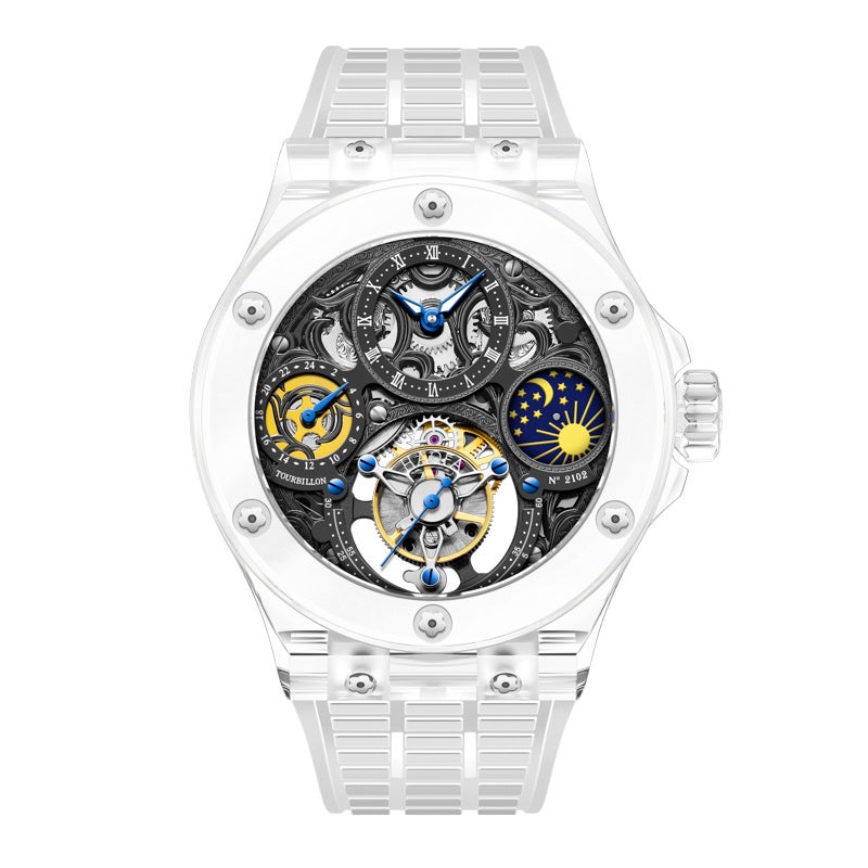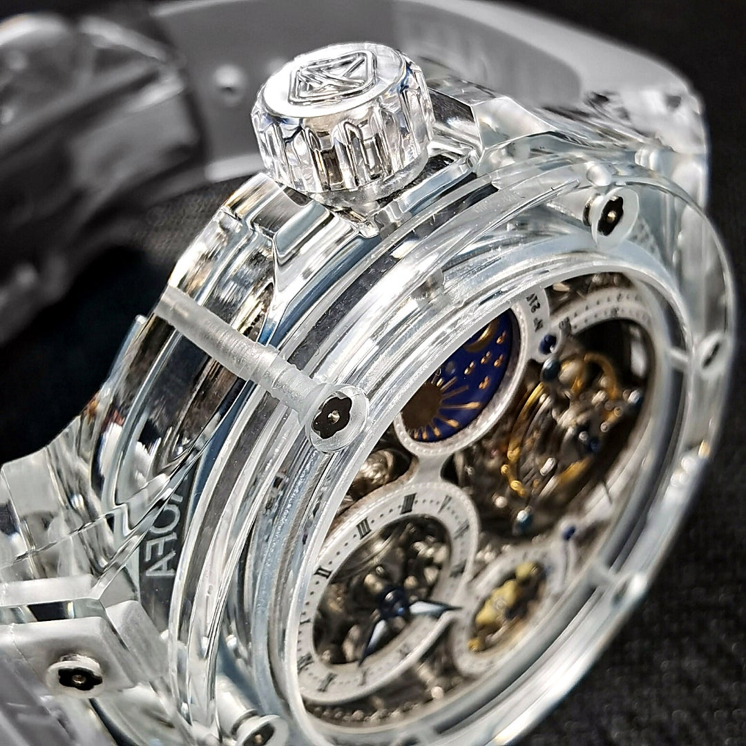 精密なムーブメントを全方向から堪能。フルクリスタル・トゥールビヨン腕時計。
