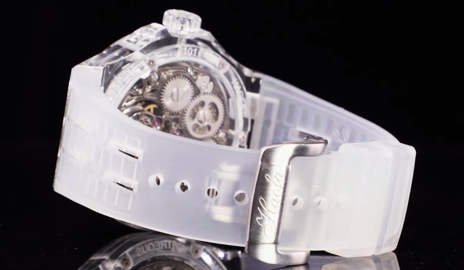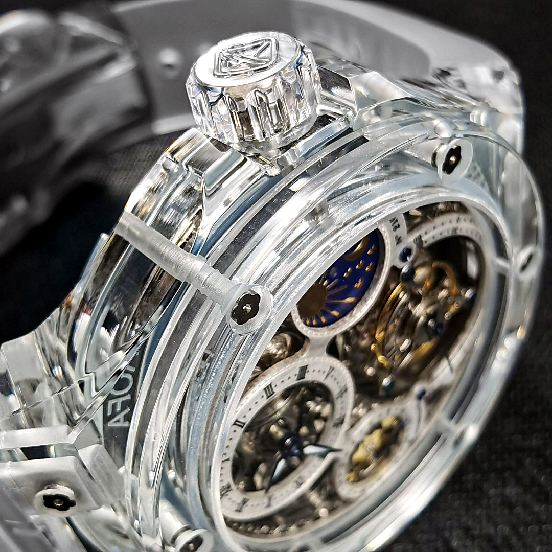 近年、製造技術の向上によりケースの一部にガラスを採用したモデルが増えてきましたが、ガラスの加工が困難なため良品が取れず製品化できなかったり、仕上げにかかる膨大な手間や時間のため、殆どのモデルは裏蓋やラグやベゼルが金属製でした。多くのモデルがケース全体をガラス製とするまでには至りませんでした。