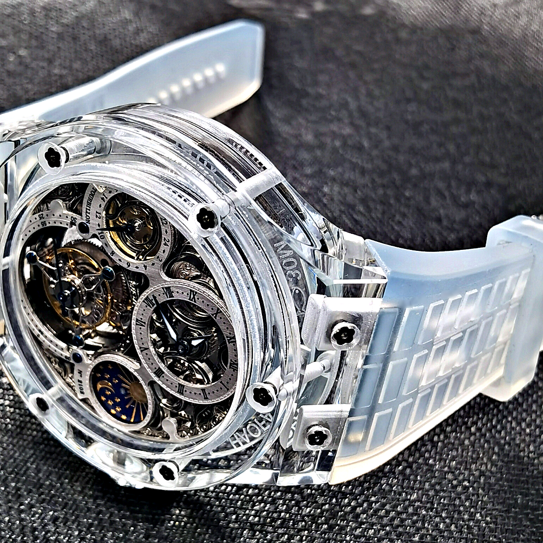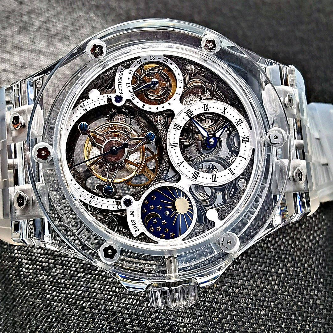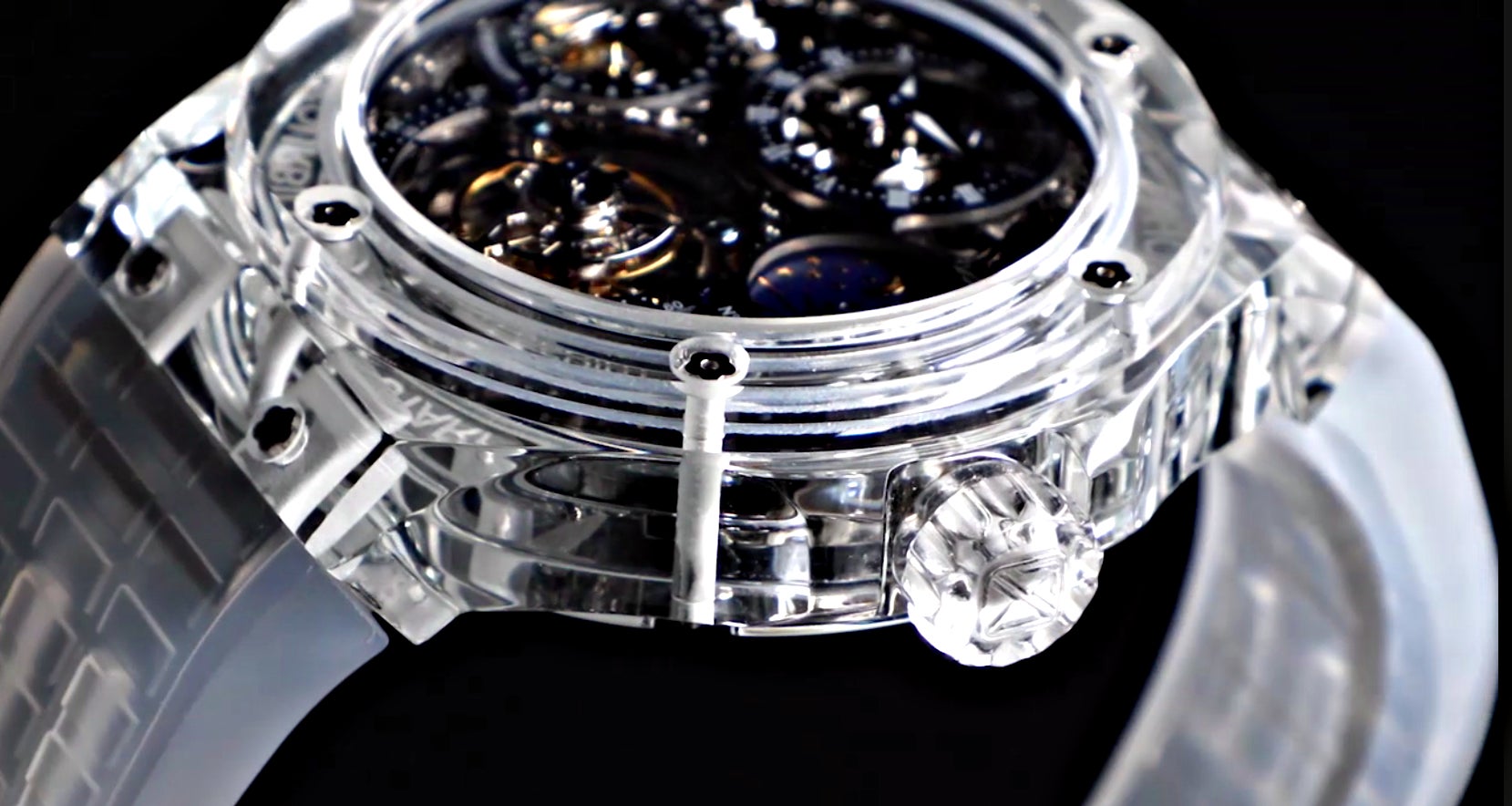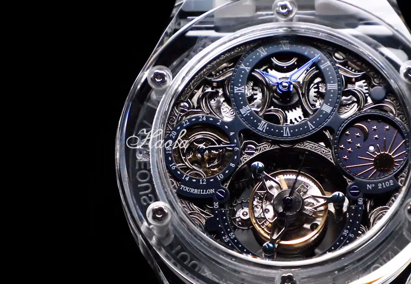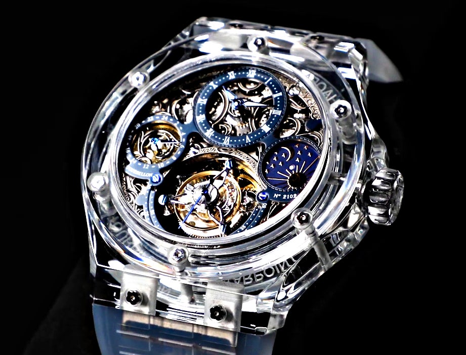 1.圧倒的な透明感を持つクリスタルガラスケースと複雑機構トゥールビヨン融合の傑作。