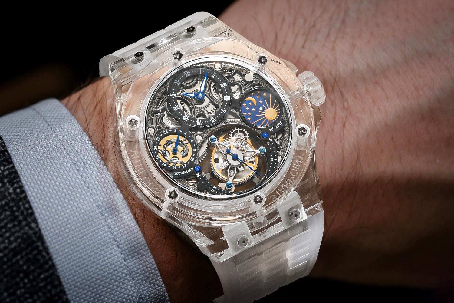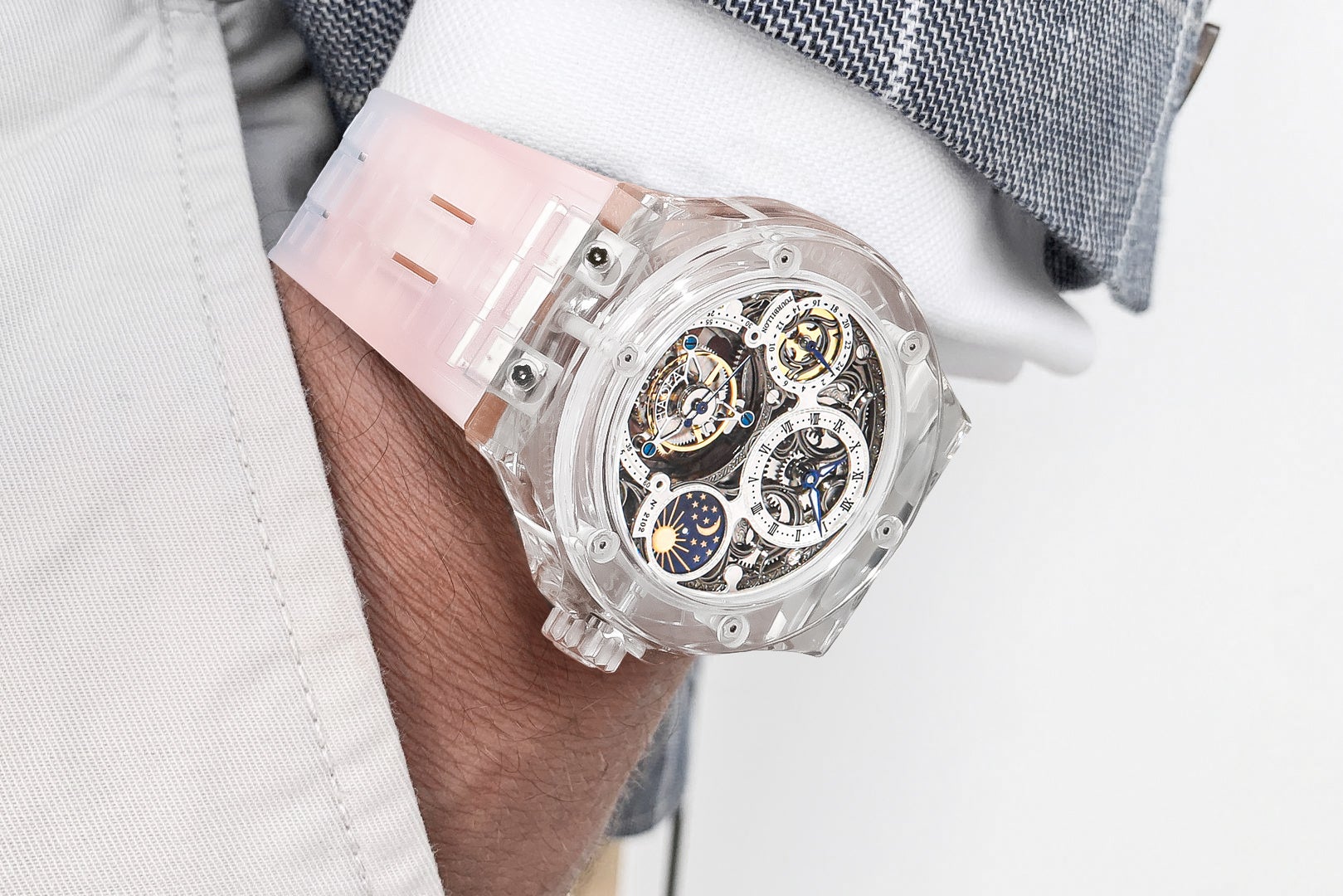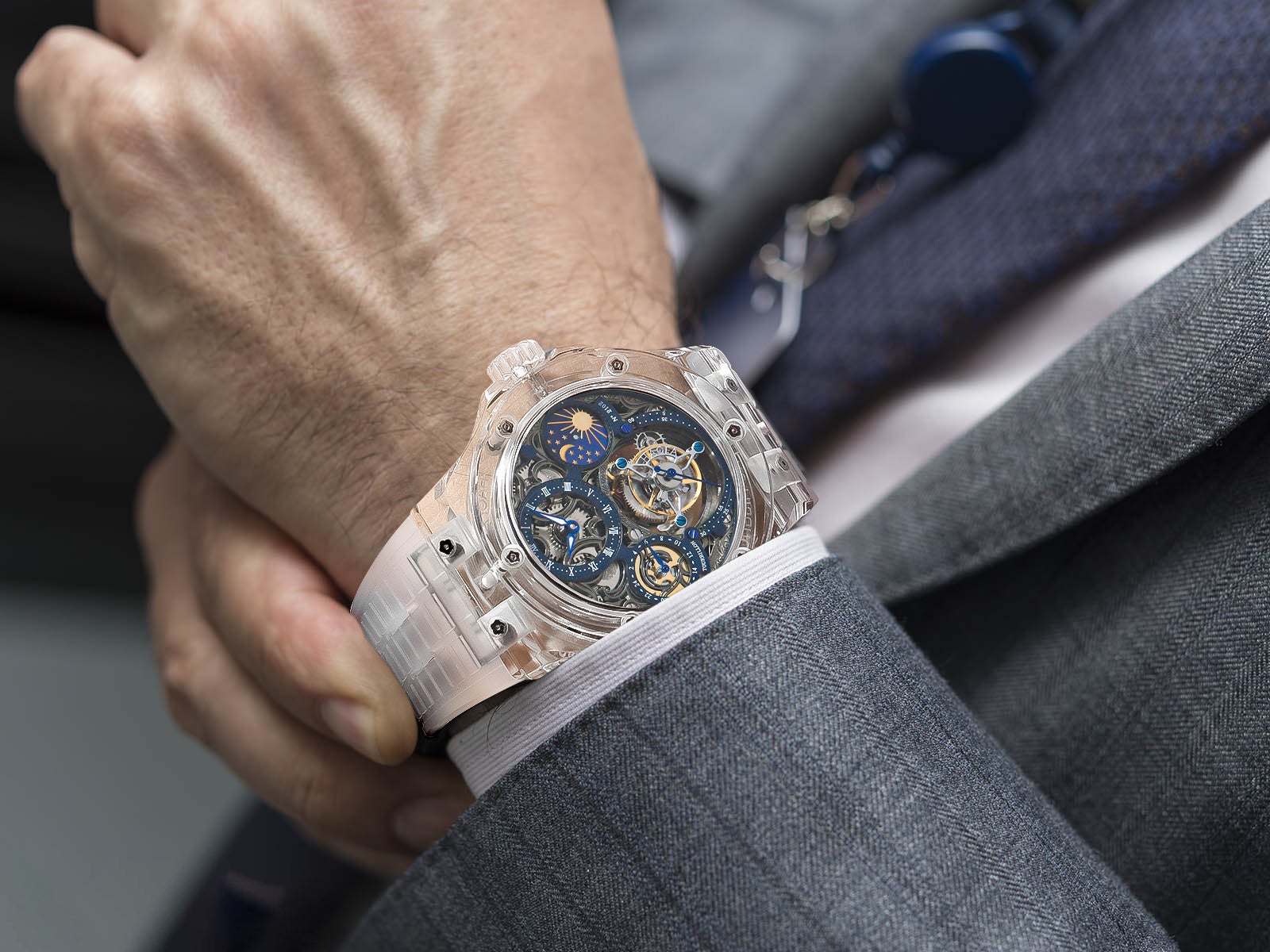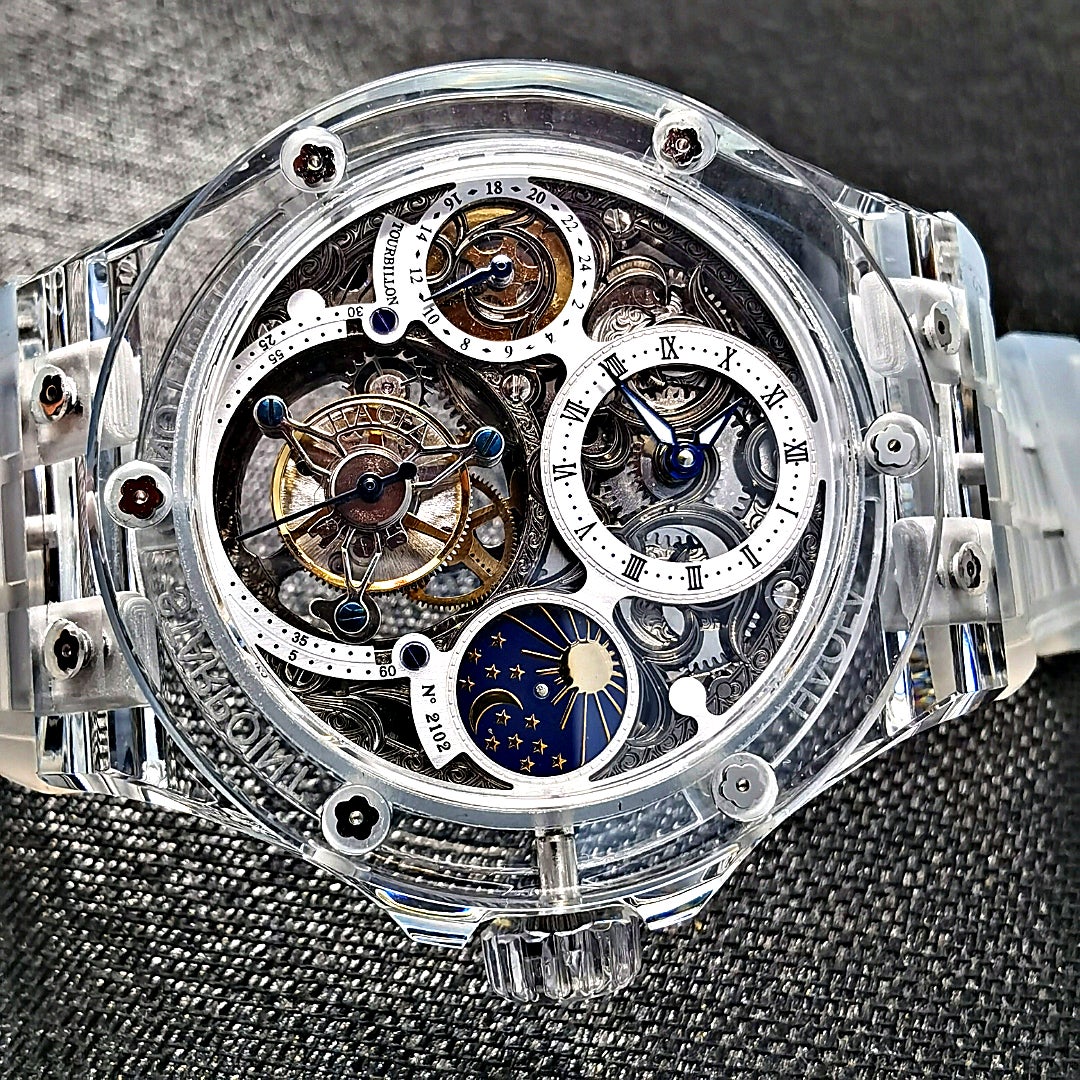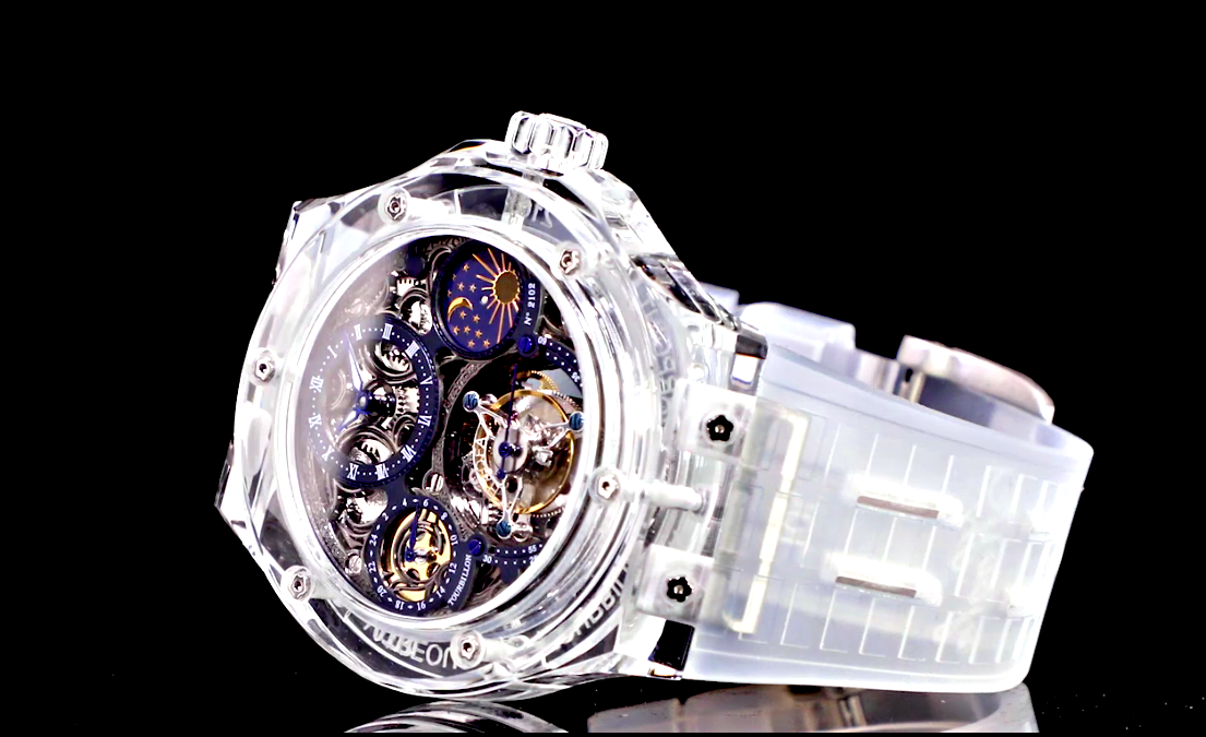 1.圧倒的な透明感を持つクリスタルガラスケースと複雑機構トゥールビヨン融合の傑作。