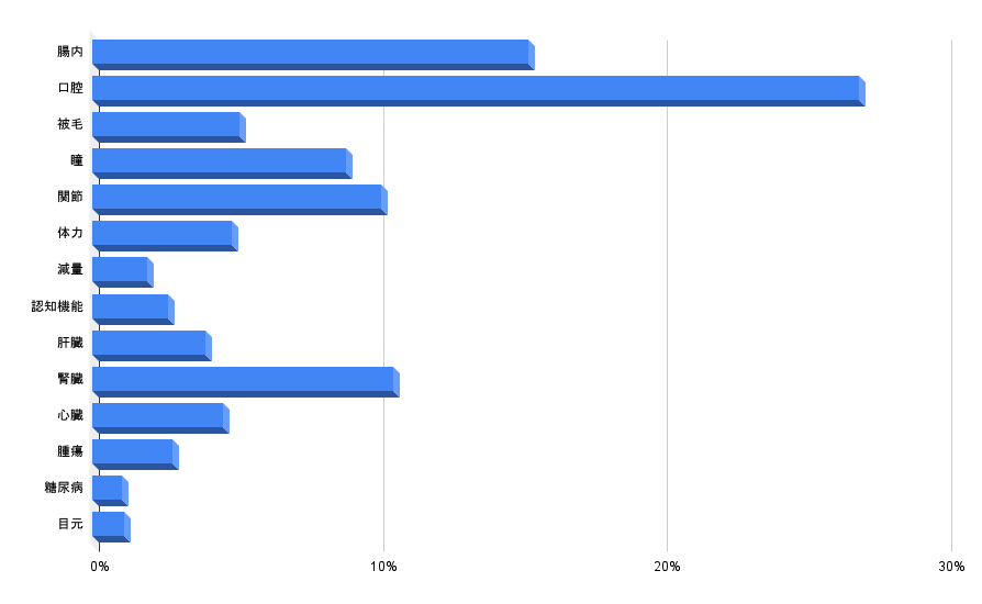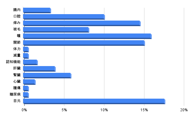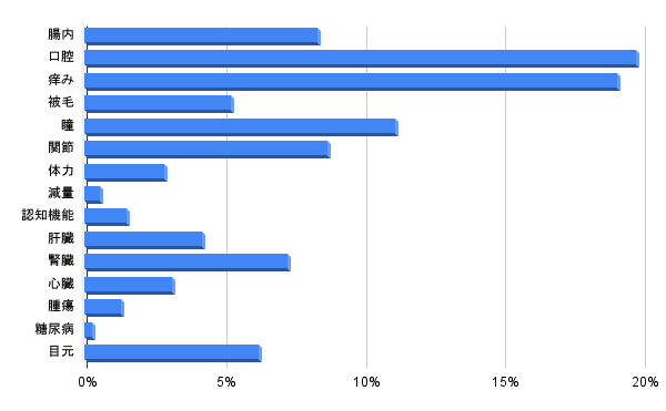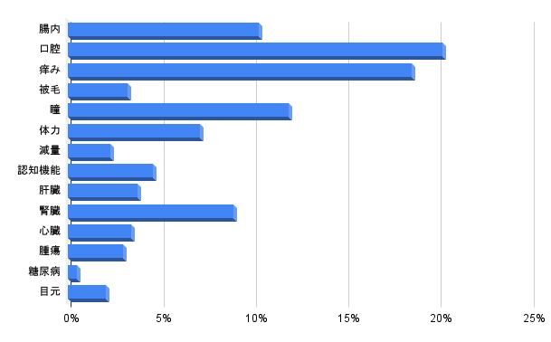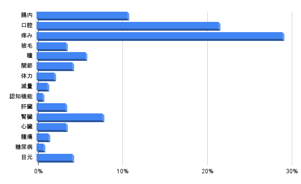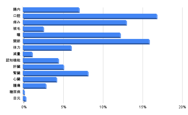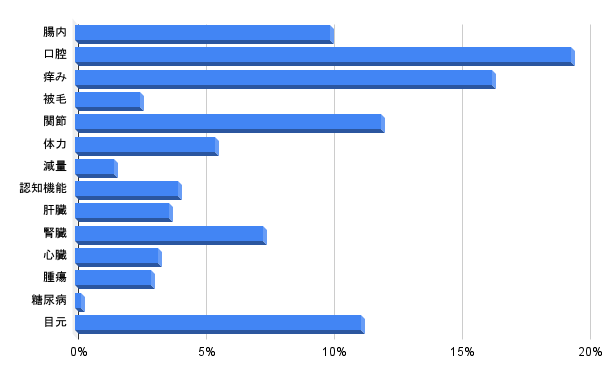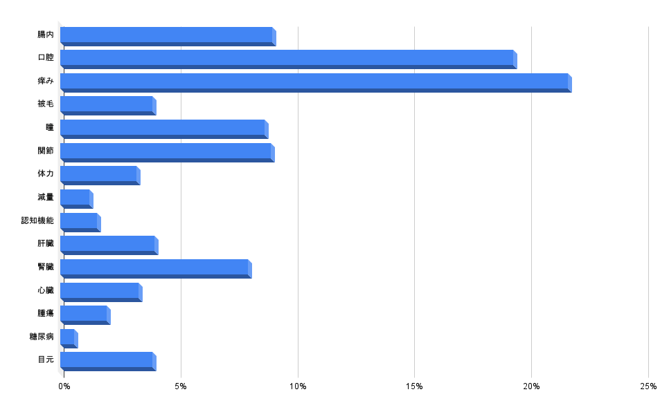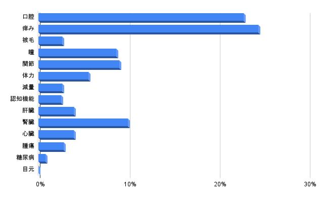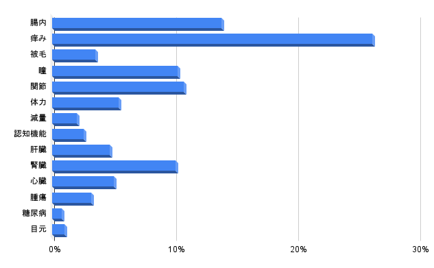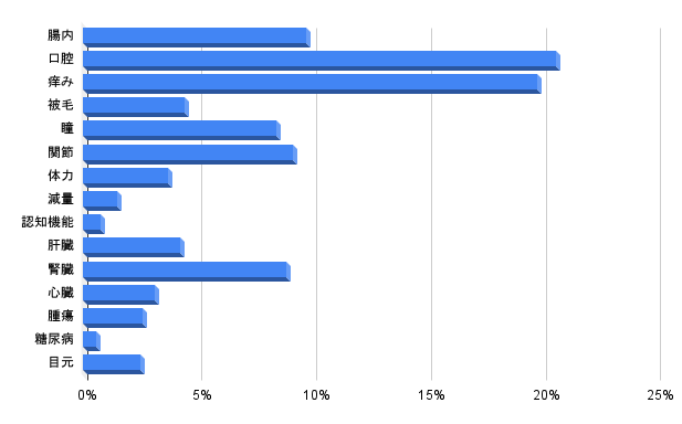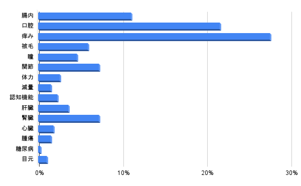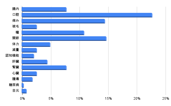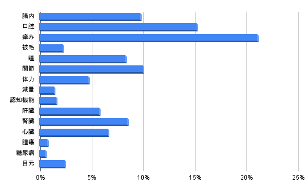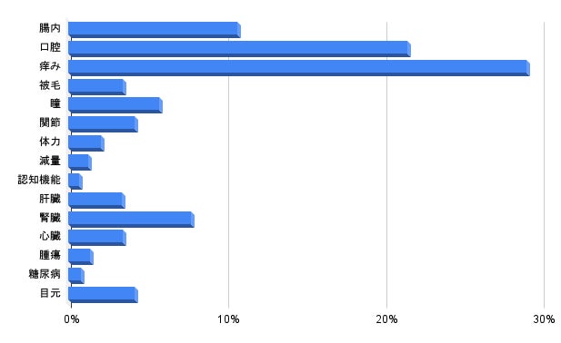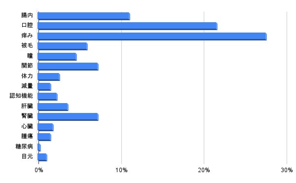 | ・約5人に1人が痒み、口腔ケアを意識 ・約10人に1人が腸内、関節、瞳ケアを意識 ・上位5項目は全て飼い主が気がつきやすい項目 |