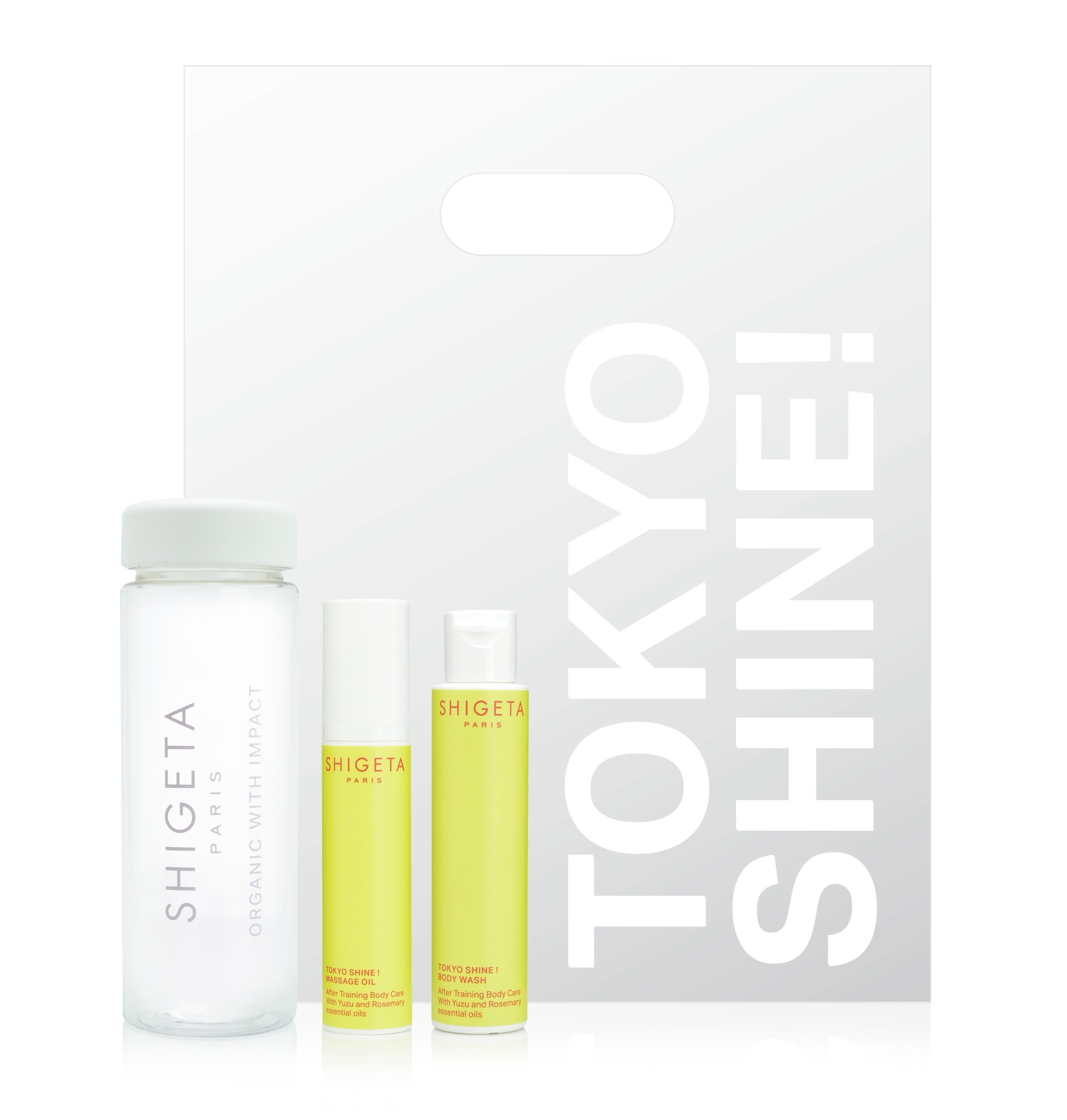 スポーツ後のお肌を労わりながら清潔に保つボディーウォッシュと、マッサージによってスポーツ後の身体をゆるめ、労わるマッサージオイル。ゆずやローズマリー、シナモンなどのエッセンシャルオイルがフレッシュでさわやかな香りをもたらし、スポーツの後の爽快感を持続させます。スポーツに出かける時にそのまま持っていけるよう、SHIGETAオリジナルビニールバッグとタンブラーをセットにした限定キット。