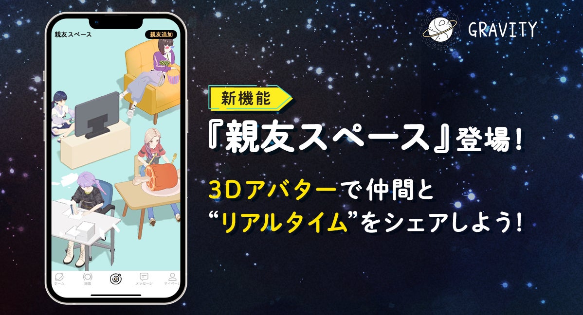 HiClub株式会社(本社:東京都港区、代表取締役社長:梶野剛)が提供する、 共感で繋がるSNS 「GRAVITY」(グラビティ)(iOS、Android版)は、さらなるコミュニケーションの活性化を目指し、3Dアバターを活用して“今の状態”を共有できる新機能『親友スペース』をリリースしました。