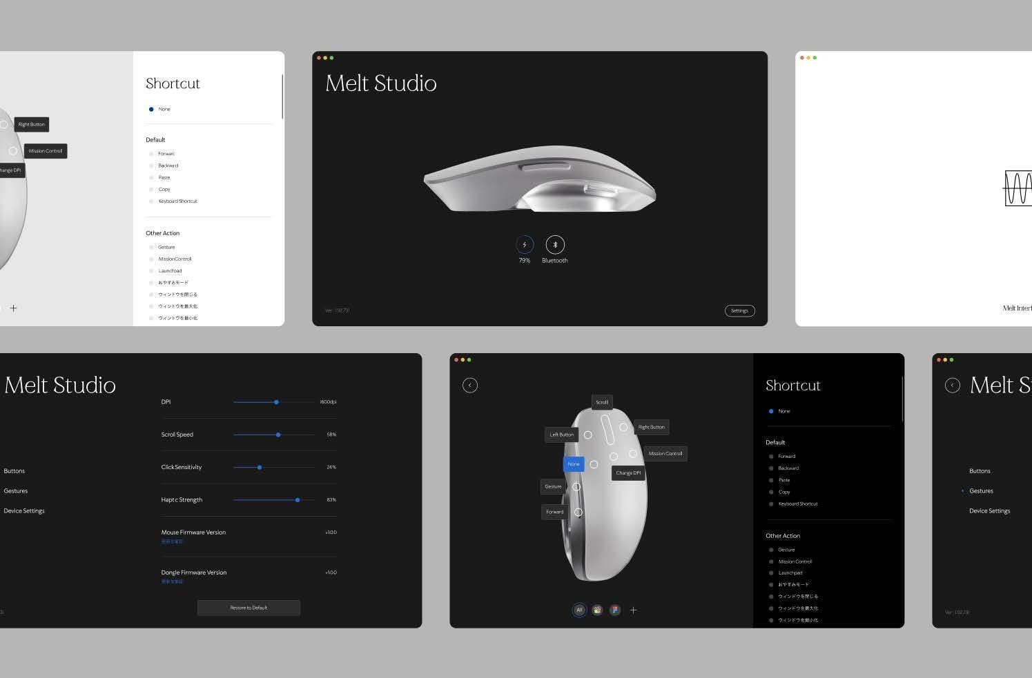 専用アプリ 「Melt Studio」 では、クリックの重さ、スクロールのノッチ感、モード切り替えの操作方法、ジェスチャーへのショートカット設定などを自由にカスタマイズ可能。