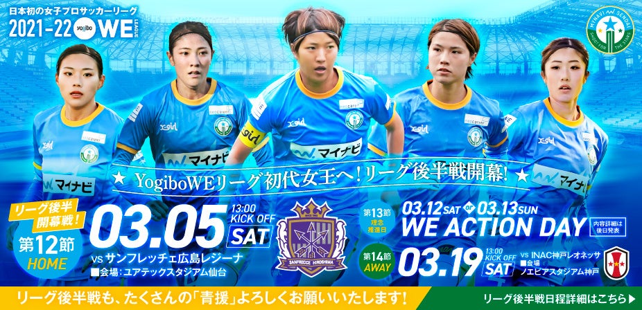 このたび、3月5日(土)より再開する2021-22 YogiboWEリーグの第11節~第22節の試合日程が決定いたしましたのでお知らせいたします。なお、未定表記のものについては、確定次第あらためてご案内をいたします。