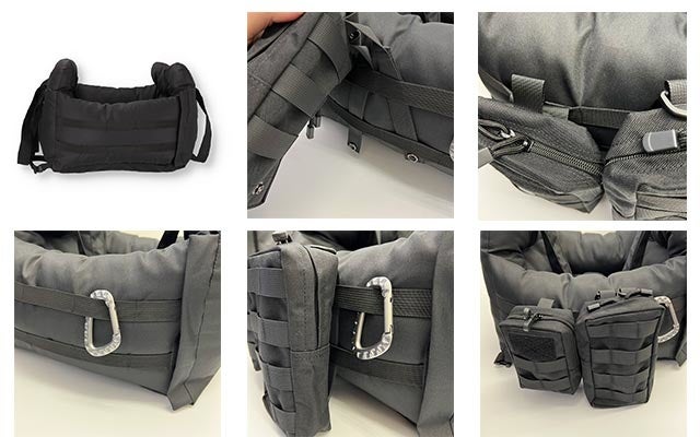 正面ポケット付き・両サイドにMOLLE/PALS (モールシステム用)ベルト2本付き・前面ファスナーで開閉可能・シート取付用長さ調整ベルト・取り外し可能リバーシブル座面クッション・飛び出し防止リードフック1本