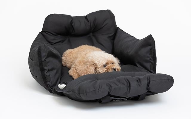 車に乗せるときは、シートベルトと付属ストラップでベッドをシートに固定できます。バッグの内側についている飛び出し防止リードを首輪・ハーネスに取り付けておけば、不意の飛び出しを制限できます。中綿たっぷりふかふかなベッドが衝撃を吸収する役割も果たします。