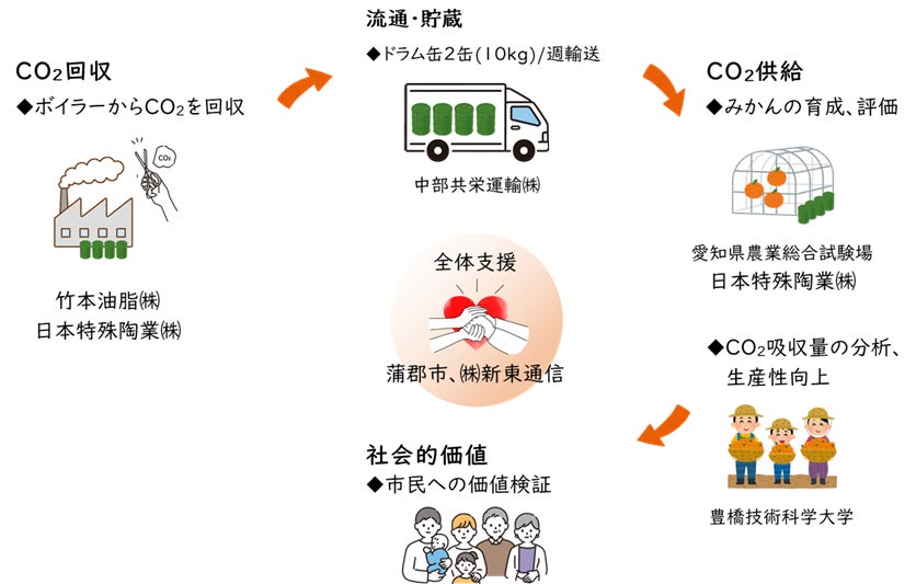 本プロジェクトでは、竹本油脂亀岩工場から排出されるCO2を回収し、日本特殊陶業の持つ回収技術で、流通用ドラム缶に回収し、中部共栄運輸が愛知県農業総合試験場常緑果樹研究室に輸送を行います。輸送されたCO2はハウスみかんの成長促進用のガスとして実証実験に再活用されます。なお、出来上がったハウスみかんはCO2を再活用した商品の社会的な価値の検証をするために使っていきます。