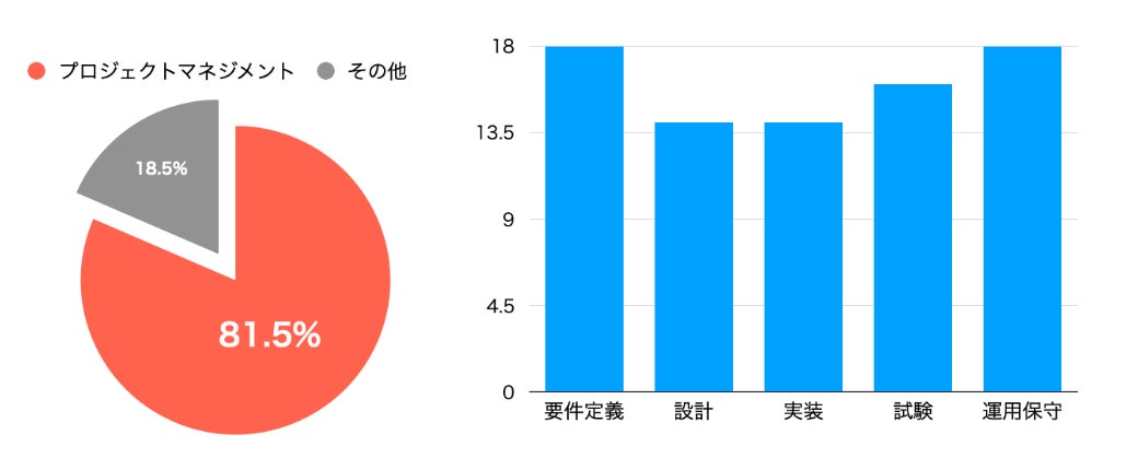 そのうち、81.5%の案件において、スケジュール管理・品質管理・工数管理・クライアント折衝などプロジェクトマネージャーの役割として関わっております。