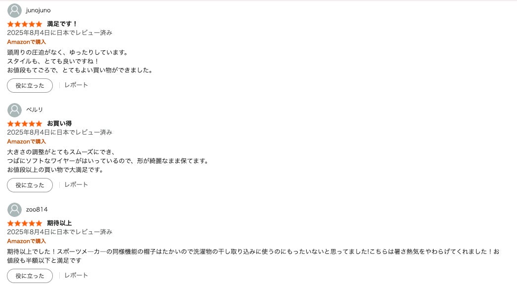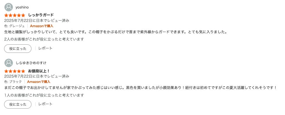 Fabrich(ファブリッチ)UV HAT(日除け帽子)は、Amazonでは71件以上のレビューがつき、4.6の評価を頂いております。レビューの一部をご紹介いたします(2025年8月5日現在)。
