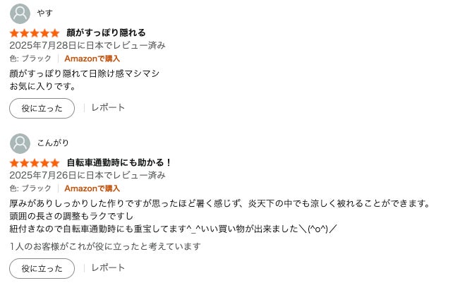 連日の猛暑の中、「車内のクーラーが涼しく感じる」「顔、後ろの首まですっぽり隠れる」といったレビューが多数寄せられ、実用性・快適性・デザイン性を兼ね備えた“令和の進化系UVアイテム”として、多くの女性から支持を集めています。 (※個人の感想です)