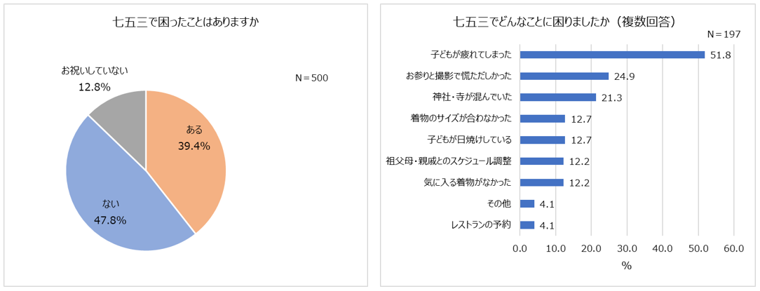 まず、七五三で困ったことがあるかを尋ねると、「ある(39.4%)」と回答した人は約4割でした。具体的には、「子どもが疲れてしまった(51.8%)」という回答が最も多く、「お参りと撮影で慌ただしかった(24.9%)」、「神社・寺が混んでいた(21.3%)」が続きました。