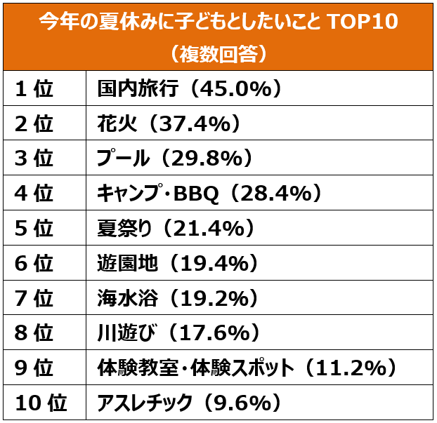 続いて、今年の夏休みに子どもとしたいことについて尋ねると、4割以上が「国内旅行(45.0%)」と回答し、一番人気でした。次に「花火(37.4%)」、「プール(29.8%)」、「キャンプ・BBQ(28.4%)」、「夏祭り(21.4%)」が続き、夏休みの恒例行事を挙げる人が多いことが分かりました。