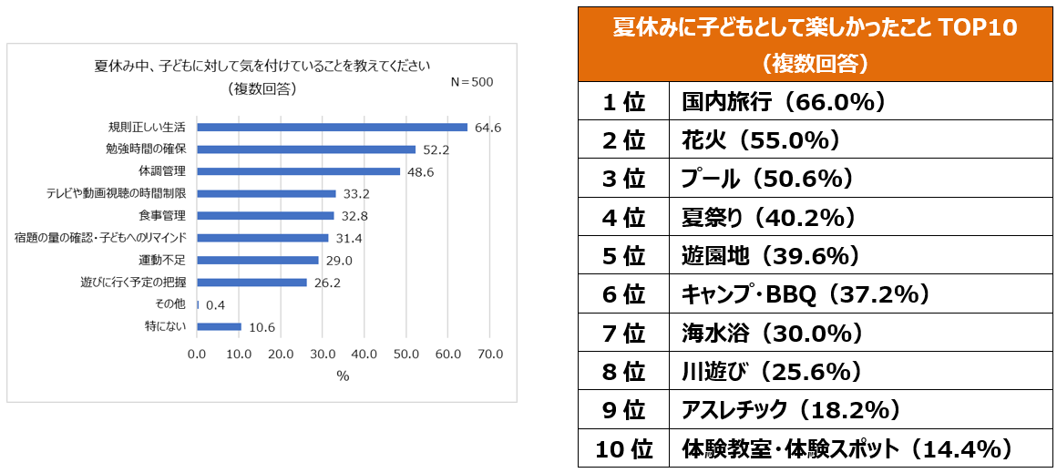 子どもとの夏の思い出を調査!パパママ500名が回答。親子の夏休み、楽しかったこと1位「国内旅行」。今年も4割以上が「国内旅行」に行きたい!夏休み中、6割以上の親が子どもの「規則正しい生活」を意識