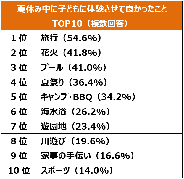 子どもに体験させて良かったことは、1位「旅行(54.6%)」、2位「花火(41.8%)」、3位「プール(41.0%)」、4位「夏祭り(36.4%)」と、上位4つは楽しかったことと同順位でした。一方、先述の調査で5位に入った「遊園地」は7位になり、5位には「キャンプ・BBQ(34.2%)」がランクイン。理由には、自分で調理することや不便な環境でも楽しめることなどが挙げられ、子どもの学びに繋がるイベントと考える親が多いことがうかがえました。