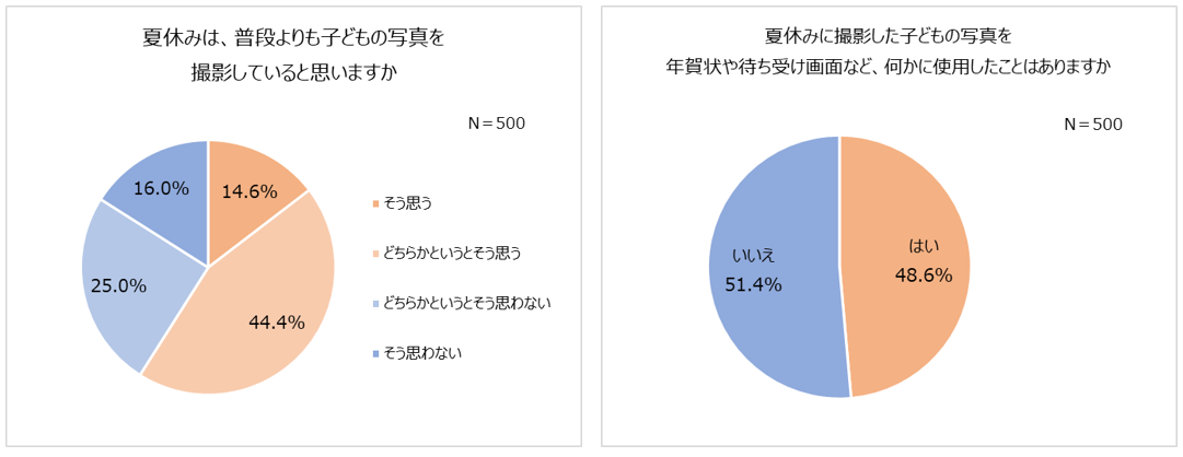 また、夏休み中に撮影した子どもの写真を年賀状や待ち受け画面に使用したことがあると回答した人も約半数おり、夏に撮影した写真は思い出に残すこと以外にも、様々な場面で使う傾向があることも分かりました。