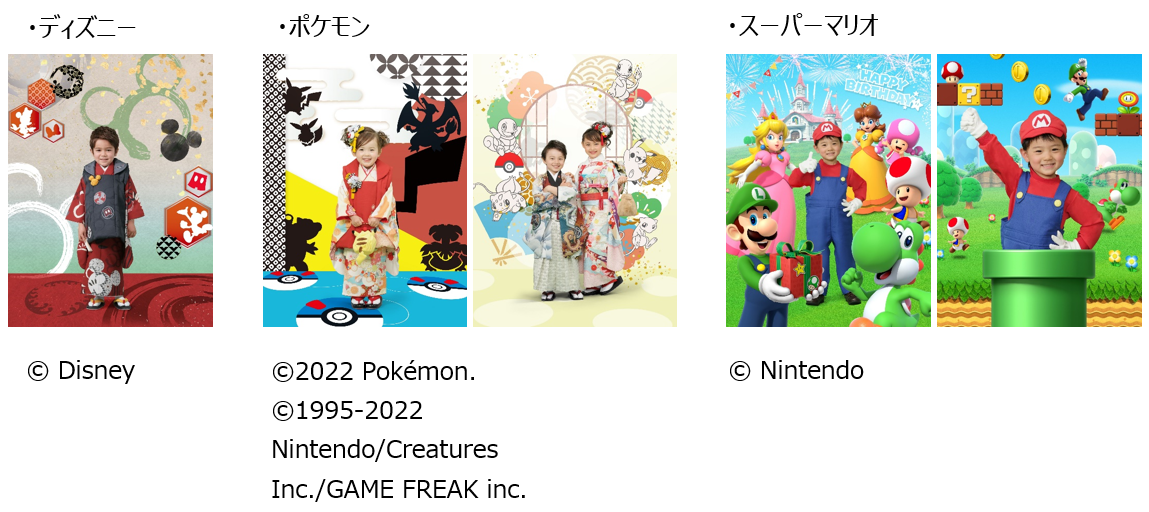 みんなが大好きなディズニーやポケモンの撮影メニューや衣装をご用意しています。さらに7月1日からはスーパーマリオも新たに仲間入り!