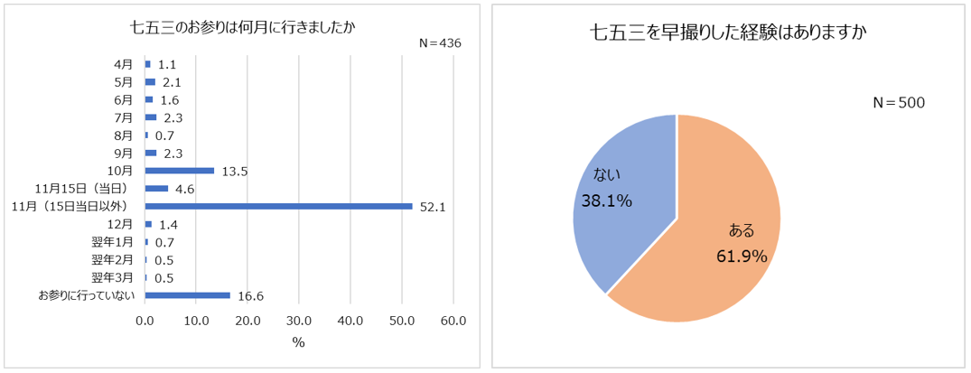 さらに、七五三についても調査。約4割が七五三で困った経験があることや、お参りした時期は11月が多いこと、6割以上が早撮りを経験していることが分かりました。スタジオアリスでは、七五三のピーク時期を避ける「夏休みに撮る七五三」をご用意しています。