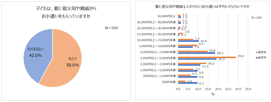 夏休みには、子どもの祖父母や親戚に会うという人も多いのではないでしょうか。その際に気になるのがお小遣い。調べてみると、約6割の子どもが夏に祖父母や親戚からお小遣いをもらっていることが判明。祖父母や親戚1人からもらうお小遣いの金額は、高学年・低学年共に「3,000円以上~5,000円未満」が最多でした。低学年の子どもは、高学年の子どもに比べて2,000円未満の回答が多い傾向がある一方で、低学年の子どもの方が高学年の子どもよりも「5,000円以上~7,000円未満」の割合が多いことも分かりました。