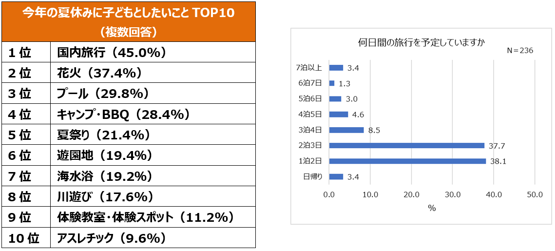 1.親子の夏休み、楽しかったこと1位「国内旅行」2位「花火」3位「プール」