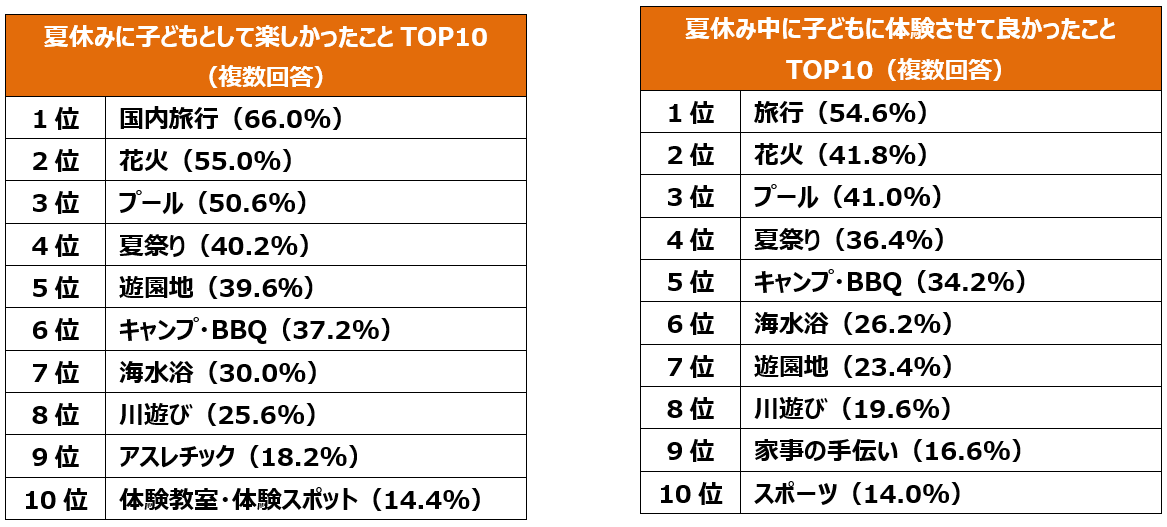 まず、子どもと過ごす夏休みで楽しかったことについて調査。ランキングにしたところ、1位「国内旅行(66.0%)」、2位「花火(55.0%)」、3位「プール(50.6%)」、4位「夏祭り(40.2%)」、5位「遊園地(39.6%)」という結果になりました。