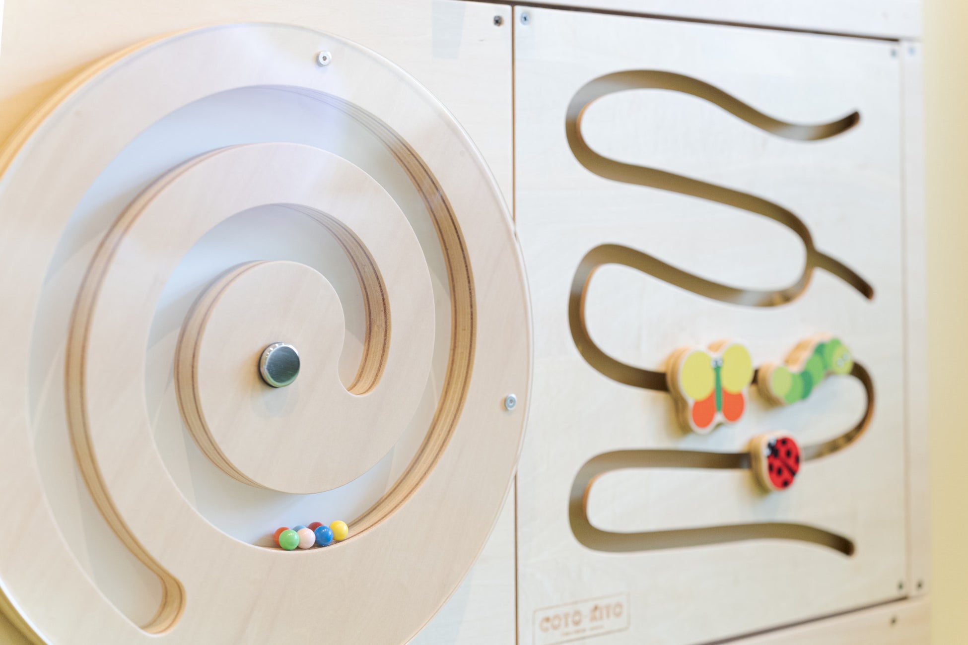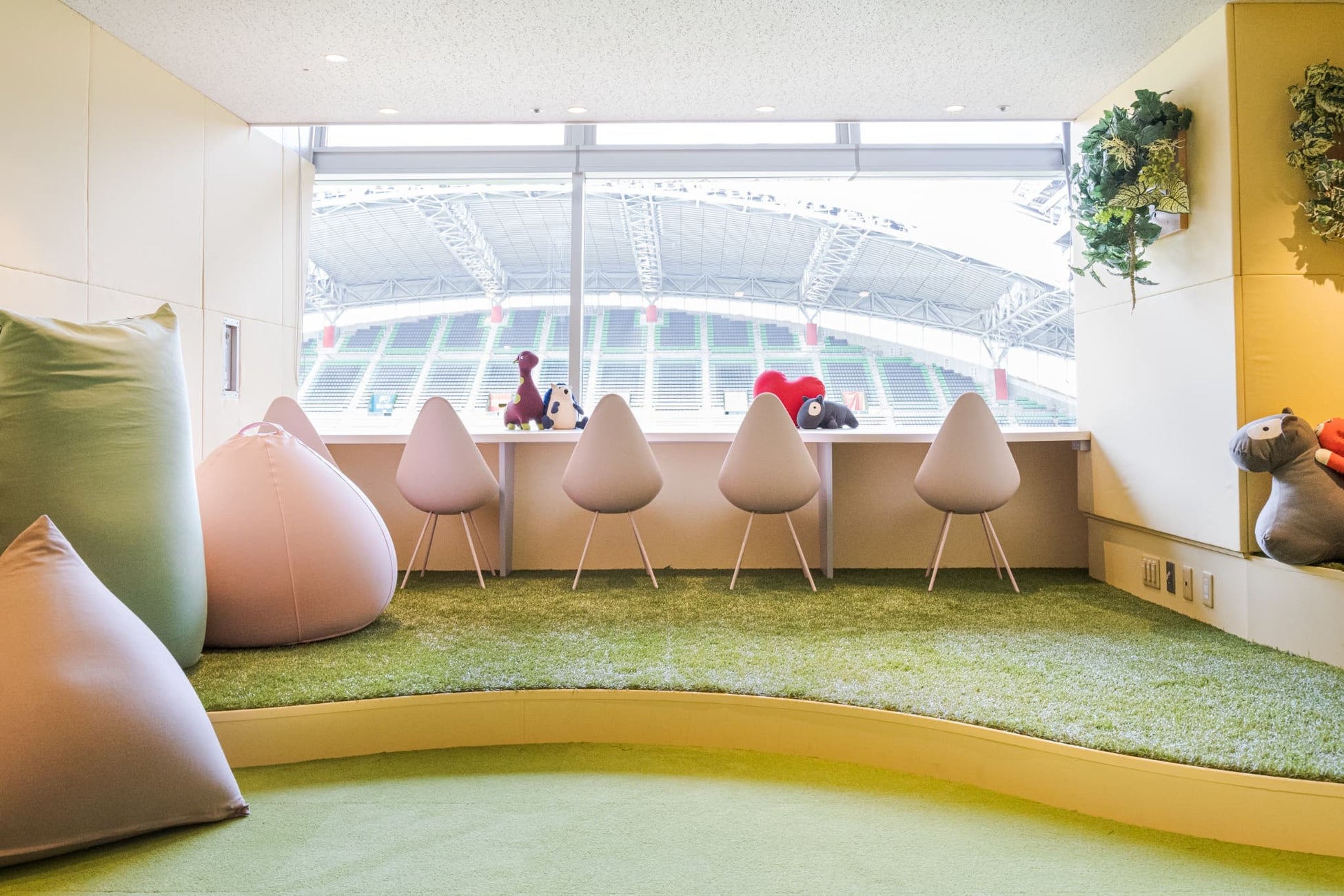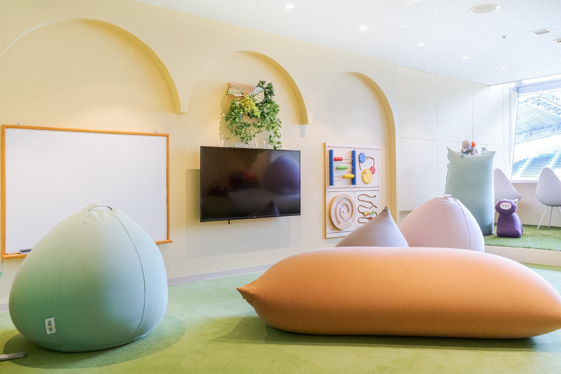 "We wanted the entire space to convey the same sense of security as being in one's mother's womb. All the materials are soft to the touch, the floor is covered in comfortable artificial turf, and the fixtures are rounded. We also selected gentle, exciting pastel colors. The Yogibo Mate, which features an animal face on it, provides good stimulation for children and has a presence that makes you want to hug it."
