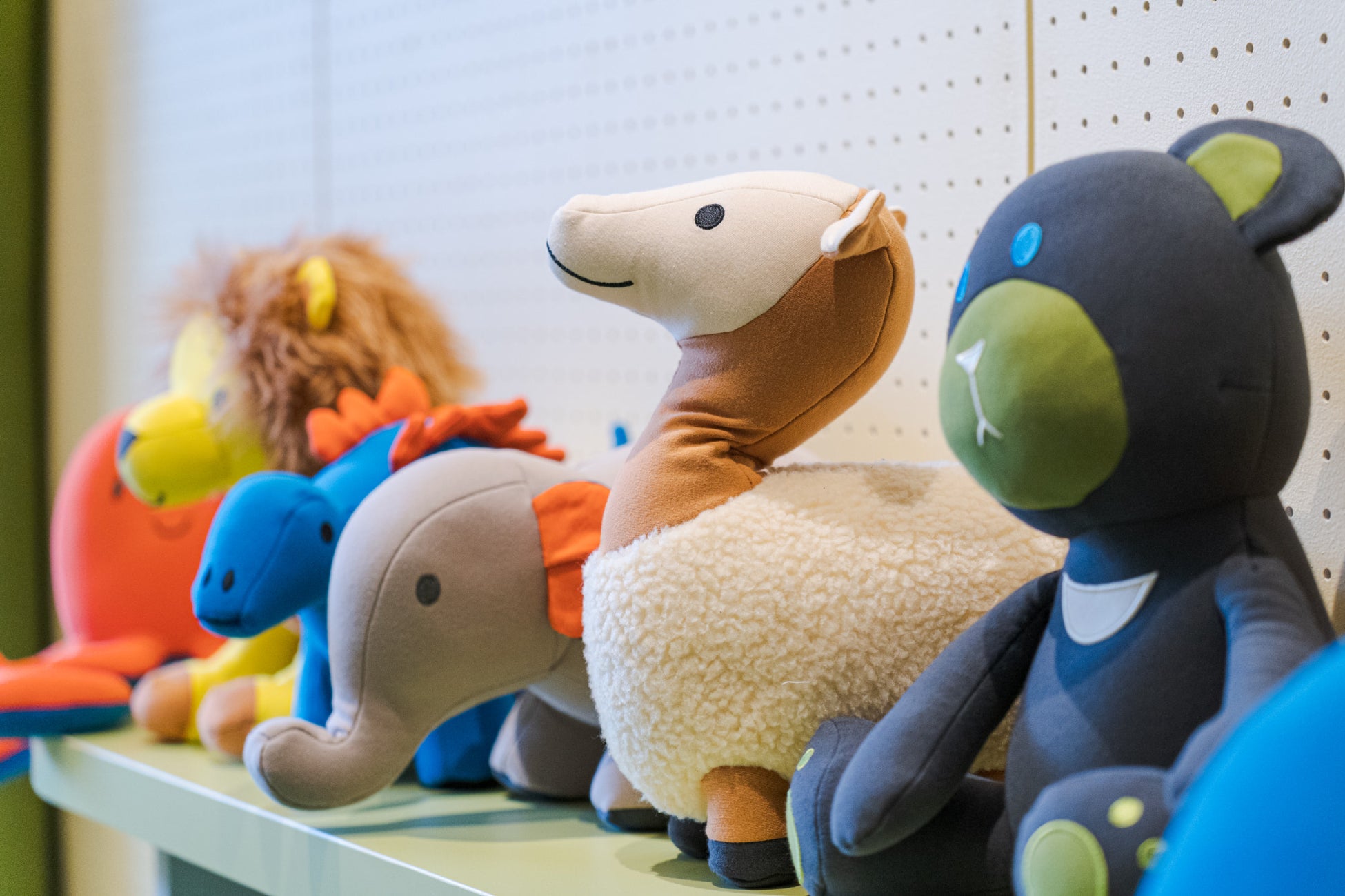 「母親のお腹にいるような安心感を、空間全体で表現したかったんです。手に触れる素材はすべて柔らかく、床には心地よい人工芝生を敷き、什器は丸みを帯びた形状にしました。色彩も優しく、ワクワクするようなパステルカラーを選定しています。動物の顔が描かれたYogibo Mateは、子供たちに良い刺激を与え、抱きしめたくなるような存在感を持たせています。」