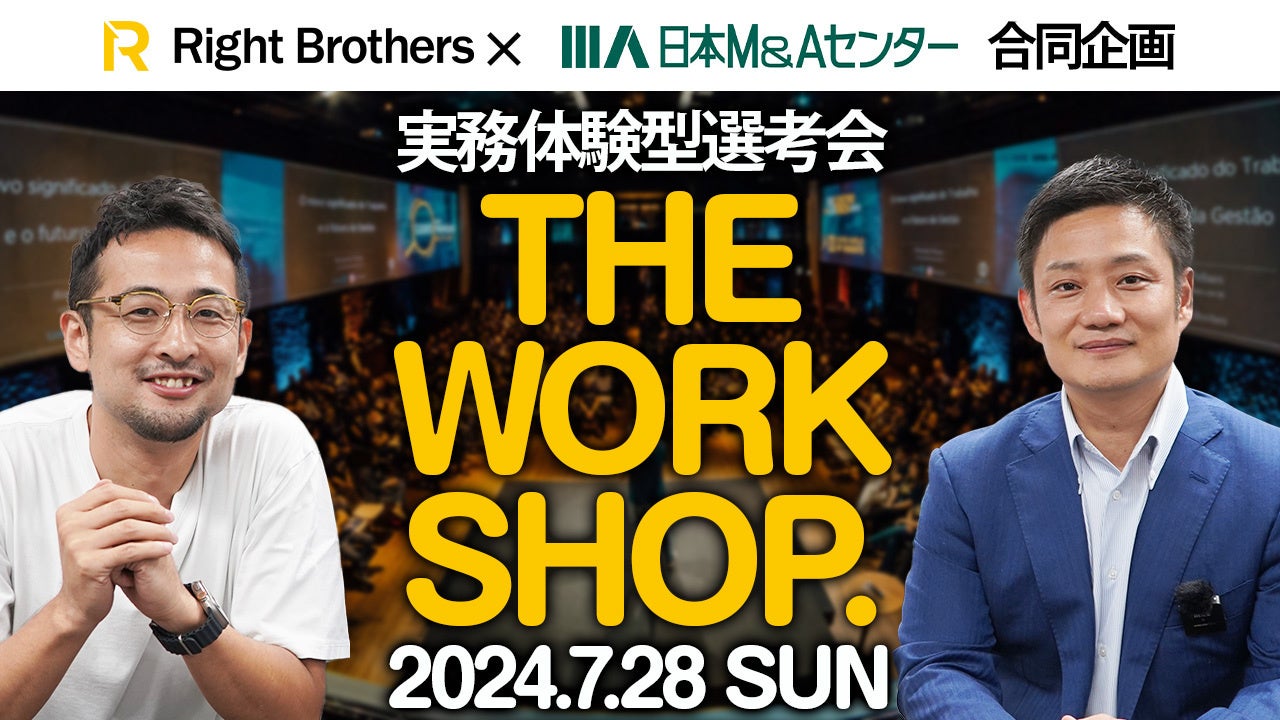 Right Brothers株式会社(本社:東京都中央区、代表取締役:高野 匠)は、株式会社日本M&Aセンター(本社:東京都千代田区、代表取締役社長:竹内 直樹)と共同で、M&A実務体験型選考会「THE WORK SHOP」を開催いたします。