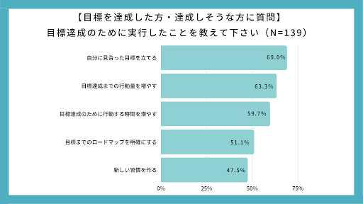 「自分に見合った目標を立てる」「習慣化する」「ロードマップを明確にする」といった回答が上位となり、目標達成のためには計画性が大切であることがわかった。