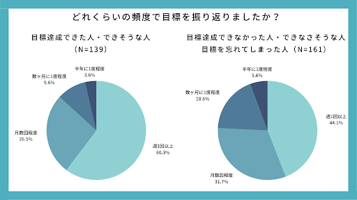 「週に1回以上目標の振り返りをしている」と回答した割合を調べると、目標達成をした人は60.4%、目標を達成していない人は44.1%と差がでた。