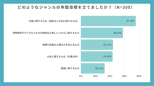 目標に設定しているジャンルの上位3つは仕事に関するものであった。