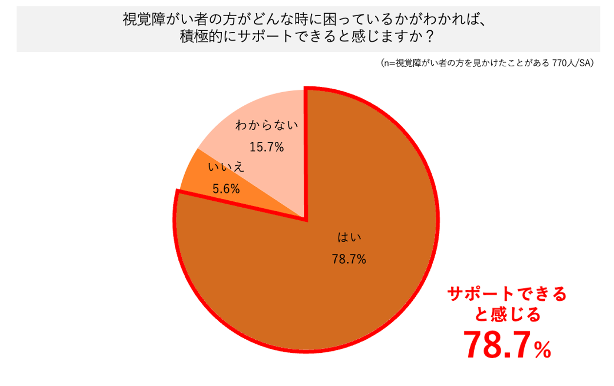 ・視覚障がい者の方がどんな時に困っているかがわかれば、積極的にサポートできると感じる人は78.7%という結果に。以上の結果から、サポートしたくてもなかなか実行に移せないジレンマが生じていることが明らかとなった。