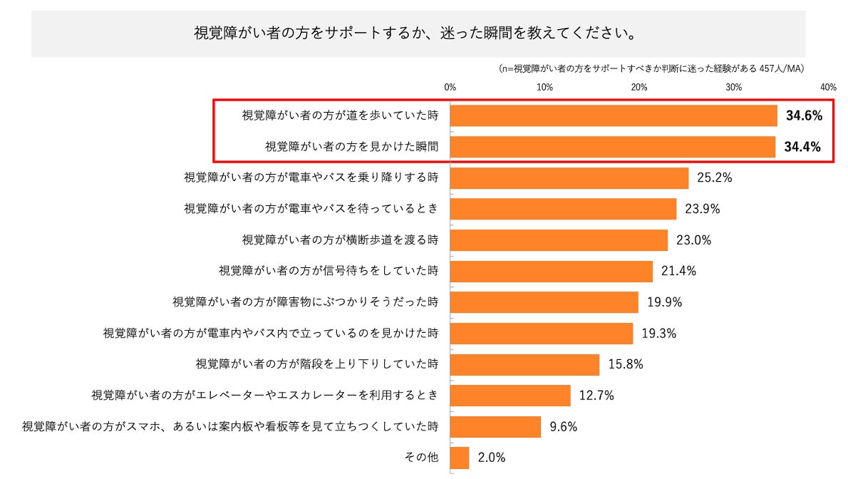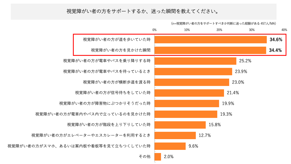 ・一方、声をかけるか迷ったシーンは「視覚障がい者の方が道を歩いていた時」「視覚障がい者の方を見かけた瞬間」が上位にランクインし、見かけた時点で配慮する方が多い傾向が窺えた。