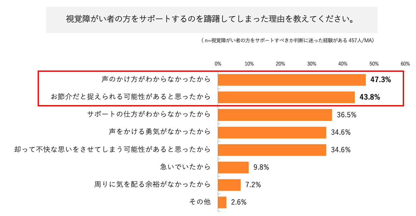アンケート調査の結果、晴眼者からは、普段の生活で視覚障がい者の方にサポートをするか迷った経験のある人は約6割にのぼり、声をかけるのを躊躇した理由は「声の掛け方がわからなかったから」「お節介になる可能性があると感じたから」が上位となる結果に。