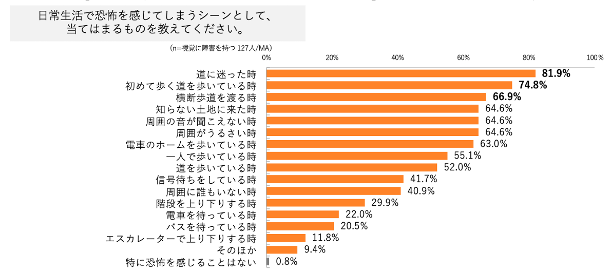 ・日常で恐怖を感じてしまうシーン第一位は「道に迷った時」で81.9%、第二位は「初めて歩く道を歩いている時」で74.8%、第三位は「横断歩道を渡る時」で66.9%。そのほか、歩いている最中の行動については、半数以上が恐怖を感じてしまいやすい傾向が窺えた。