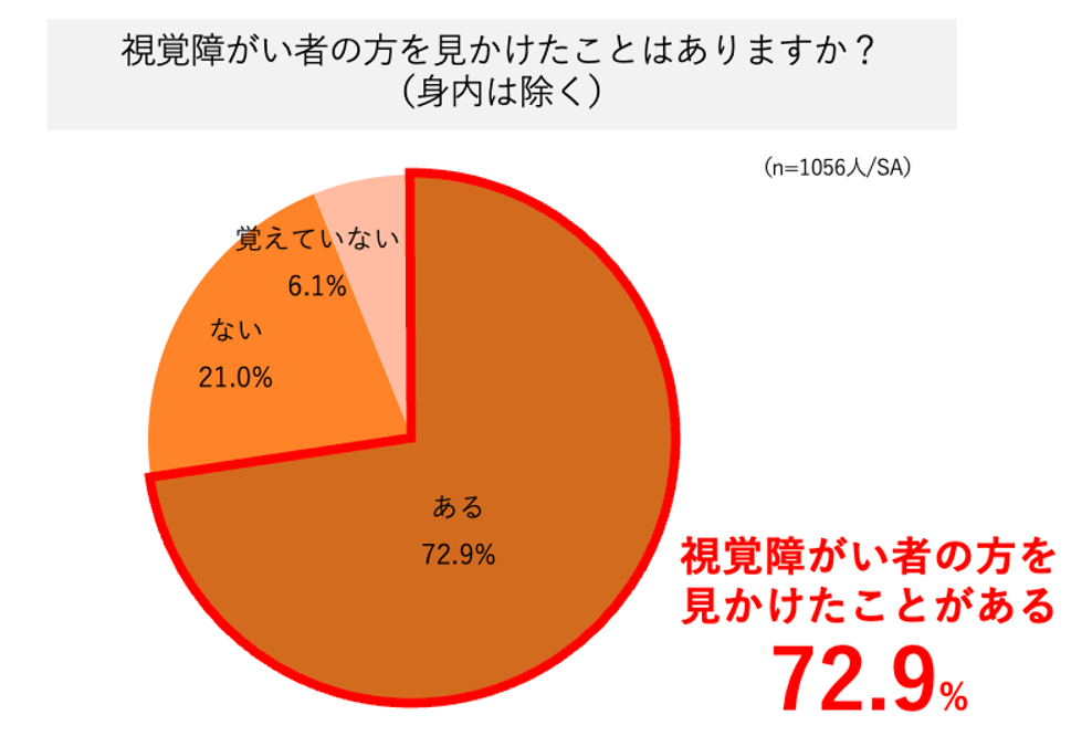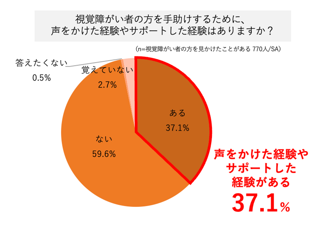 ・普段の生活で身内を除き、視覚障がい者の方を見かけたことがある人は72.9%。そのうち視覚障がい者の方を手助けするために、声をかけた経験あるいはサポートした経験がある人は37.1%に止まる結果に。