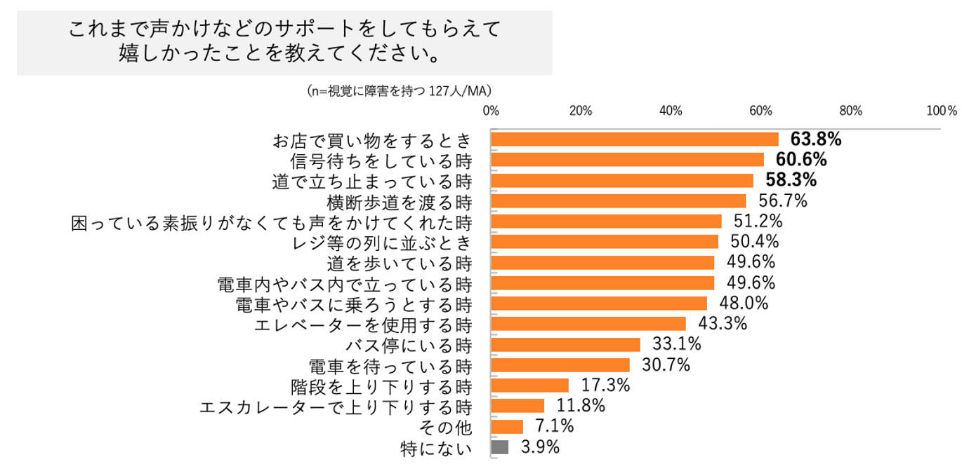・これまで声かけなどサポートをしてもらえて嬉しかったシーンについては、第一位「お店で買い物をする時」で62.8%、続いて第二位は「信号待ちをしているとき」、第三位は「道で立ち止まっている時」。今後サポートしてもらえると嬉しい瞬間については、第一位「音のない信号を横断するとき」で79.5%、第二位は「お店で買い物をする時」で70.9%、第三位は「電車内やバス内で空席を探す時」で66.9%という回答が得られた。