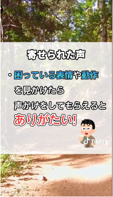 •「順調に歩いていて、特にヘルプが必要ない場合もあるので、ヘルプを断られても不快に思わないでもらいたい。立ち止まって、困っているよう表情や動作を見かけたら、積極的に声かけをしてもらえるとありがたい。」