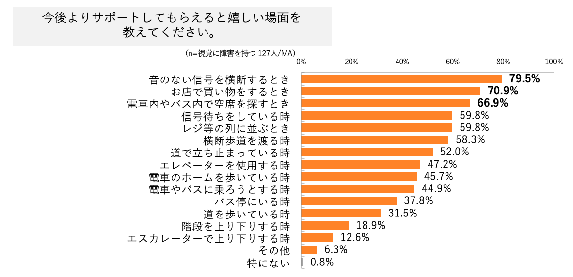 ・今後サポートしてもらえると嬉しい瞬間については、第一位「音のない信号を横断するとき」で79.5%、第二位は「お店で買い物をする時」で70.9%、第三位は「電車内やバス内で空席を探す時」で66.9%から回答が得られた。