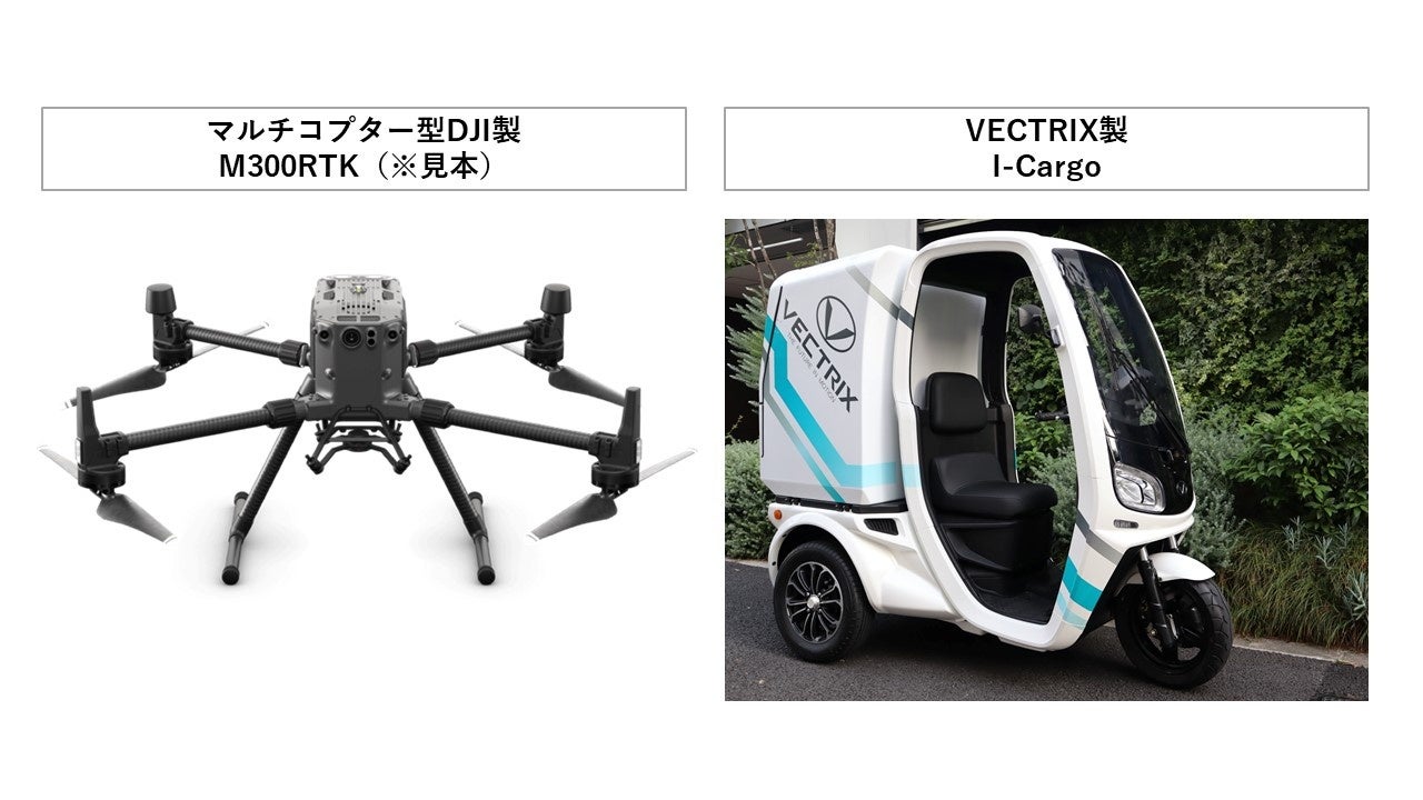 使用機体&車両 | ドローン:マルチコプター型ドローンDJI製 M300RTK 車両:VECTRIX製 I-Cargo |
