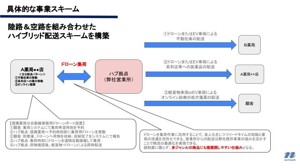 本実証実験は、薬局間における医薬品の在庫移動を想定し廃棄薬の削減や薬剤師の業務効率化、ガソリン車両を使わず、CO2排出量の削減を目的として実証実験を実施する。他の実証実験では、BtoCや緊急時を想定した実証実験が数多く実施されてきたが、今回は、BtoBの定期配送を検討し、事業ベースとして継続的で且つ実用可能な配送手段となる。