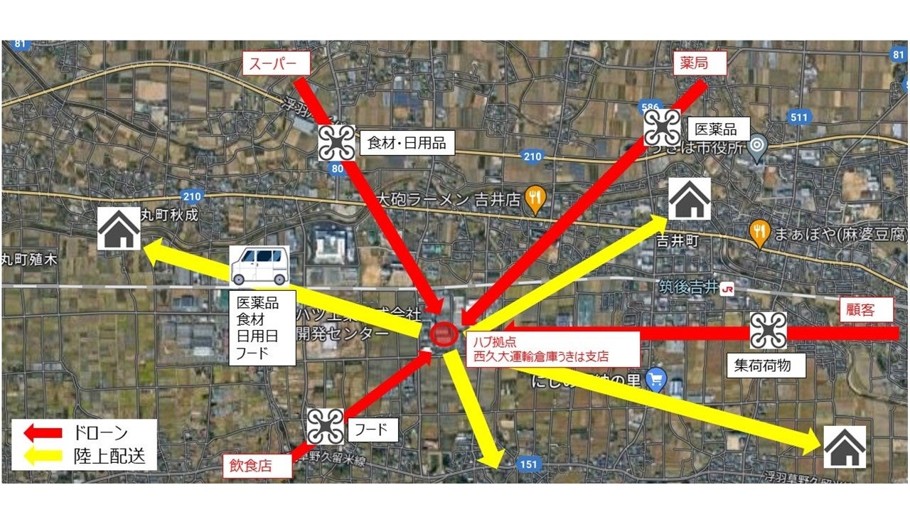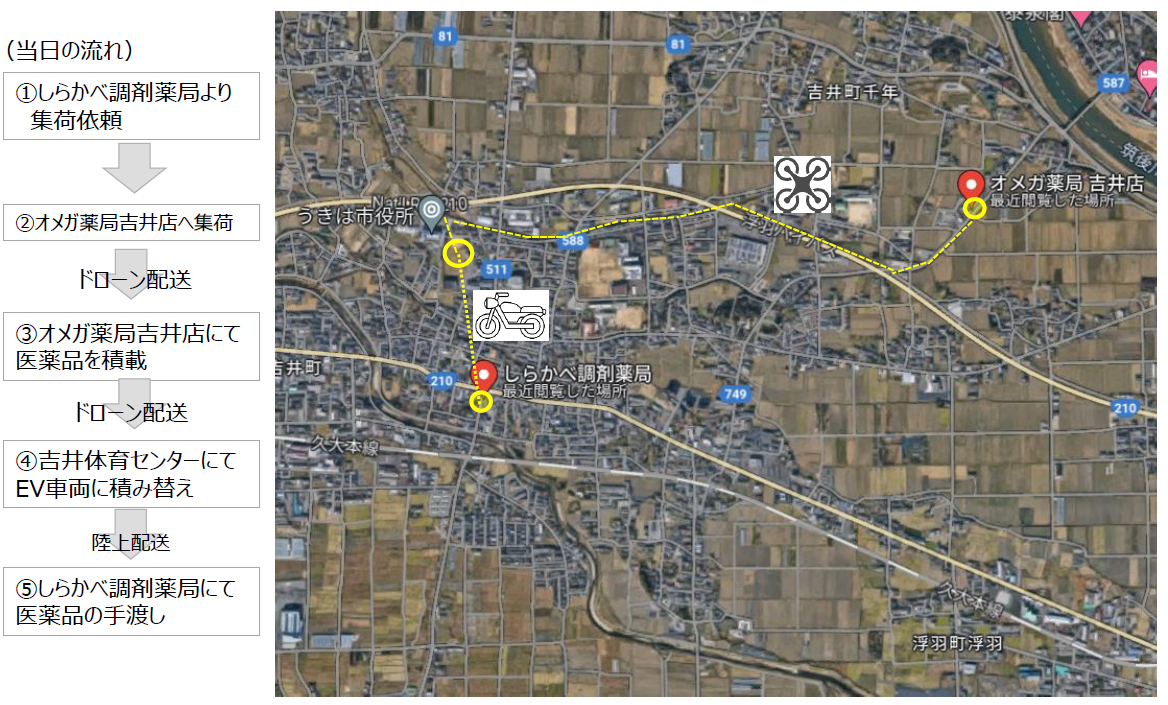 うきは市体育センターを営業所と見立て、集荷先薬局(オメガ薬局吉井店)へ河川上空を通りドローンによる集荷を実施、その後、荷物を積んだドローンは営業所に着陸、人口密集地(市街地)にある配送先薬局(しらかべ調剤薬局)へは営業所よりEV車両に積み替えを実施、陸路を活用して配送先に医薬品を届ける。
