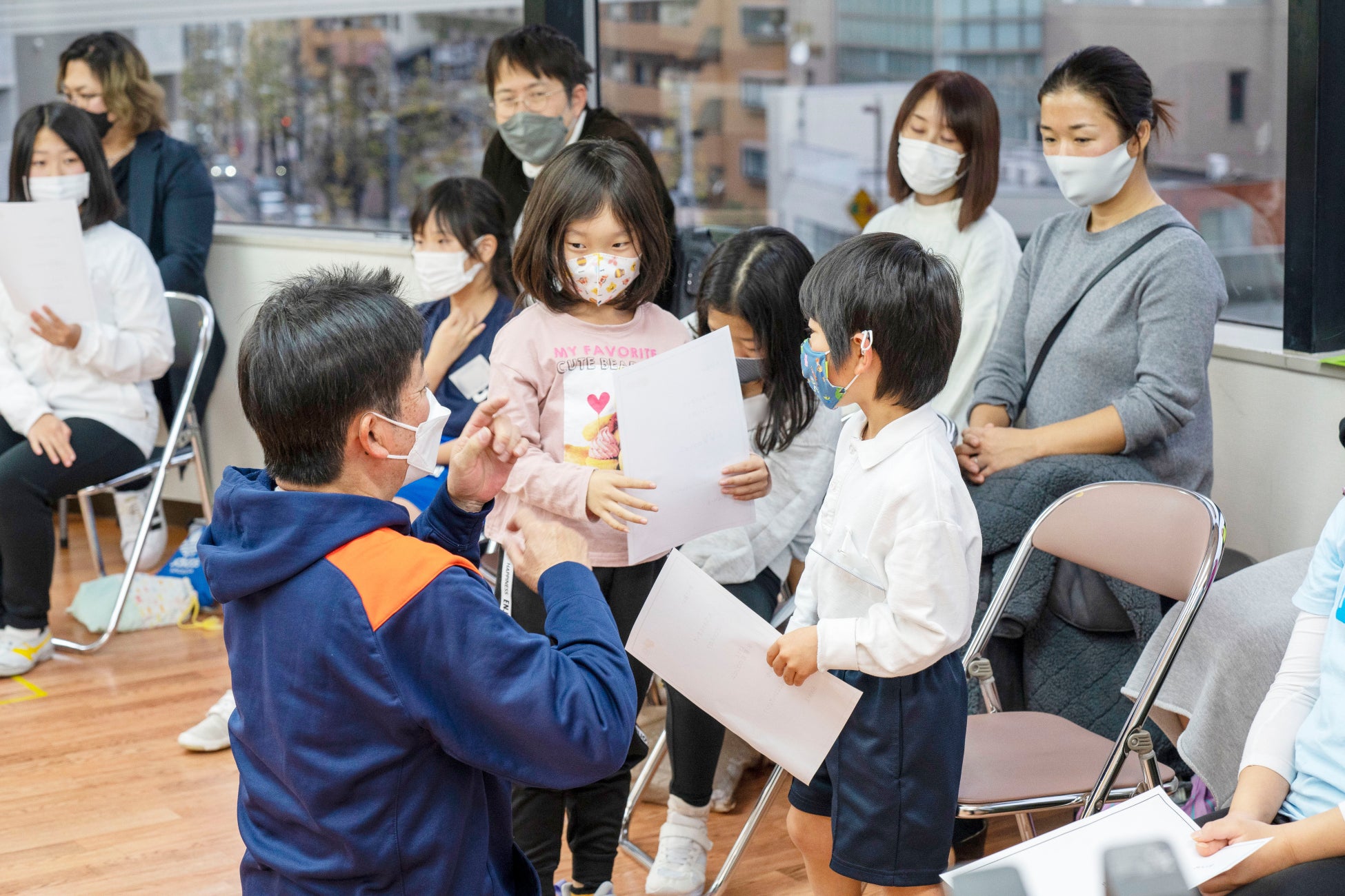 手を挙げて順番に前に出て自己紹介。さらに1人1人に、なぜ得意なの?それはおうちで犬飼ってるの?など、質問しながら会話を進めていく裕さん。自分の強み、得意なことを言葉にして相手に知ってもらうレッスン。