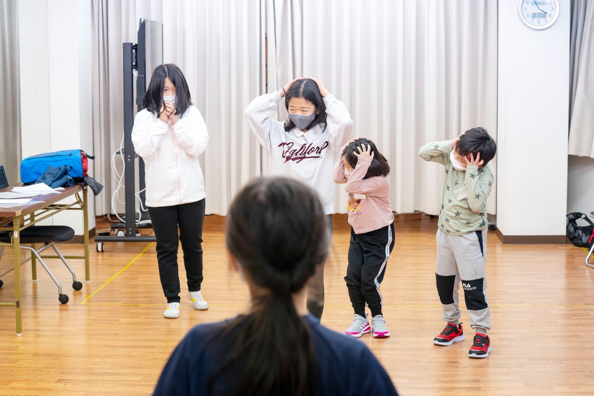「だるまさんが、アイスを食べてキーンとした!」少しポーズが違う子も。「そうだね、家の中か、外か、周りに人がいるかいないかでもポーズは変わるはず。」表現は一律じゃない。理由によっても、シチュエーションによっても変わる。これしかないと思わずに、自由に発想を広げて、表現することを楽しんでほしいレッスンです。