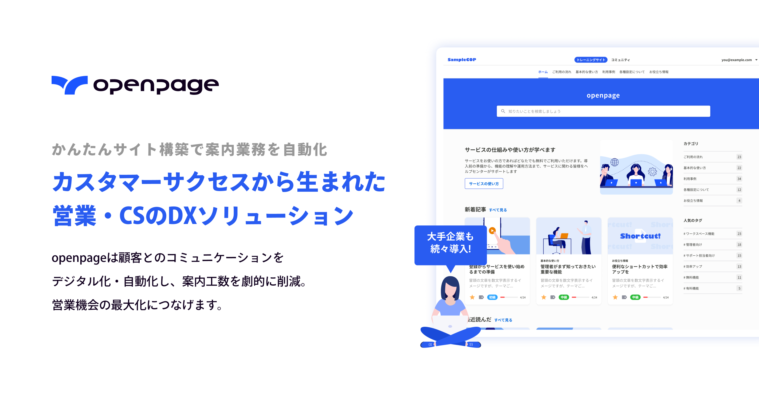 カスタマーサクセス(以下、CS)は、SaaS市場の伸びとともに急速に立ち上がり、米国では5年ほど前から注目されている新しい職業です。当社は、カスタマーサクセスを熟知するメンバーを中心に構成され、顧客取引DXツール「openpage」を開発・提供しています。合わせて、米国流のカスタマーサクセスやセールステックなど、顧客DXにおける最新情報をSNSや執筆、イベントなど様々な方法で発信し、啓蒙活動を行っております。