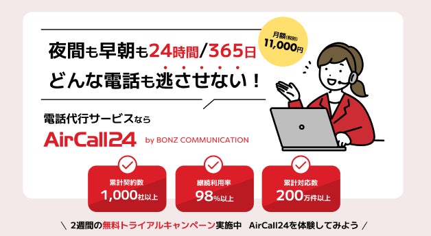 株式会社ボンズコミュニケーション(本社:神奈川県横浜市、代表取締役社長:山本 篤史)は、「24時間電話代行サービス AirCall24」でキャンペーンを実施致します。
